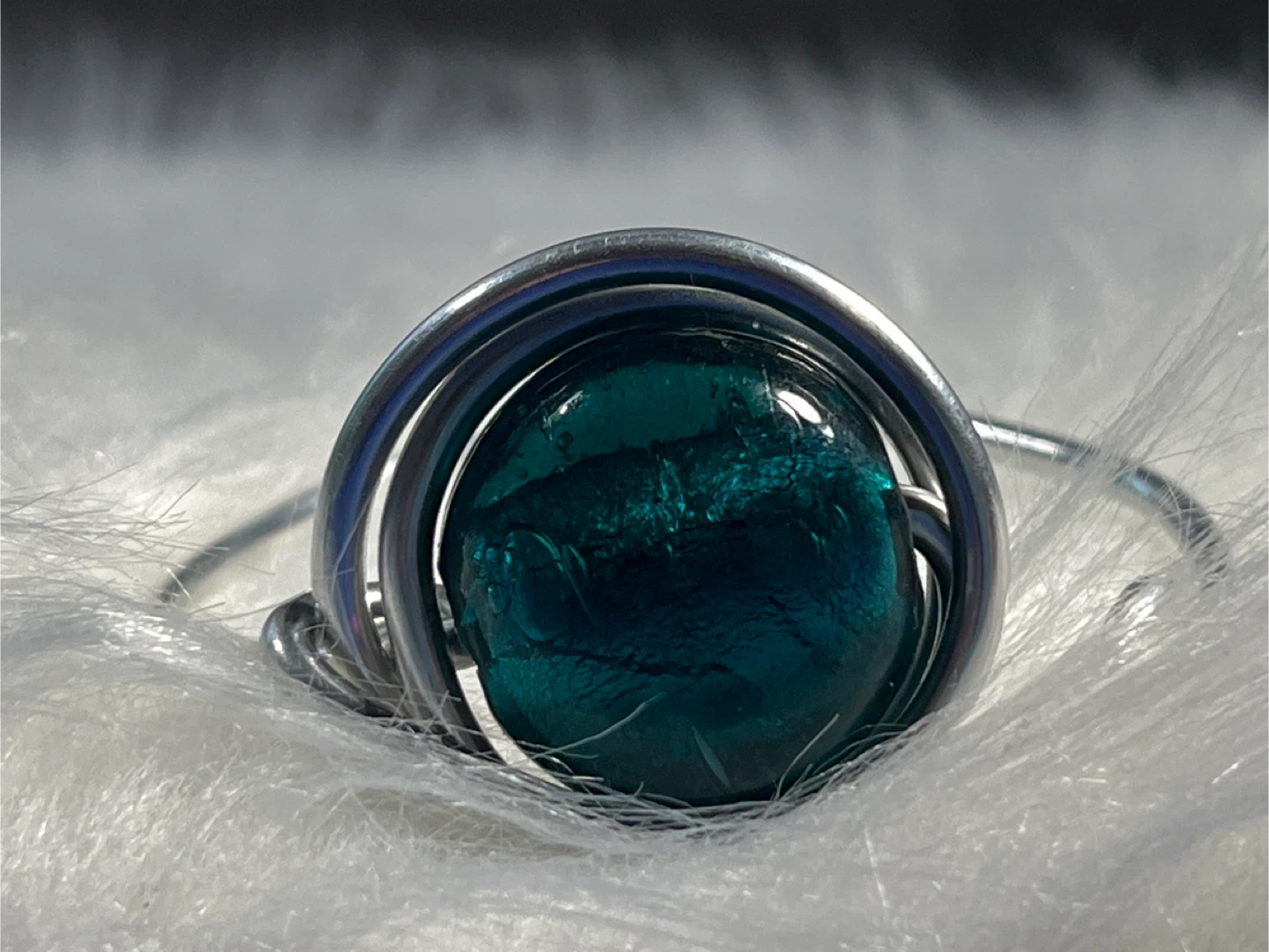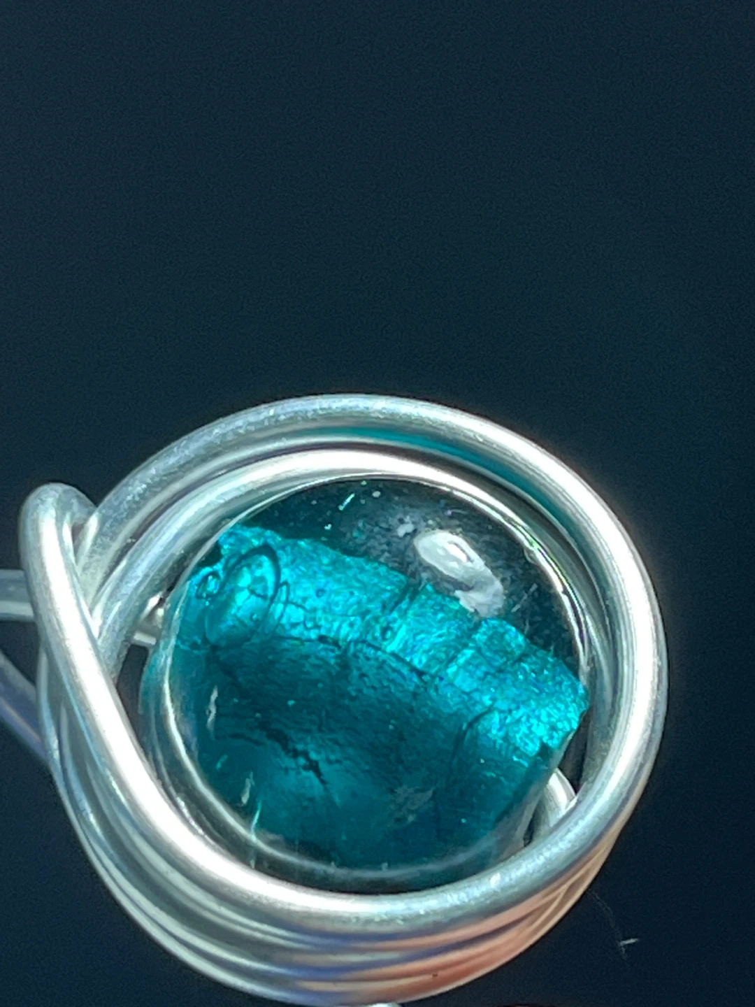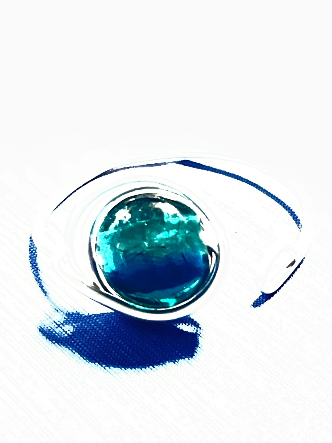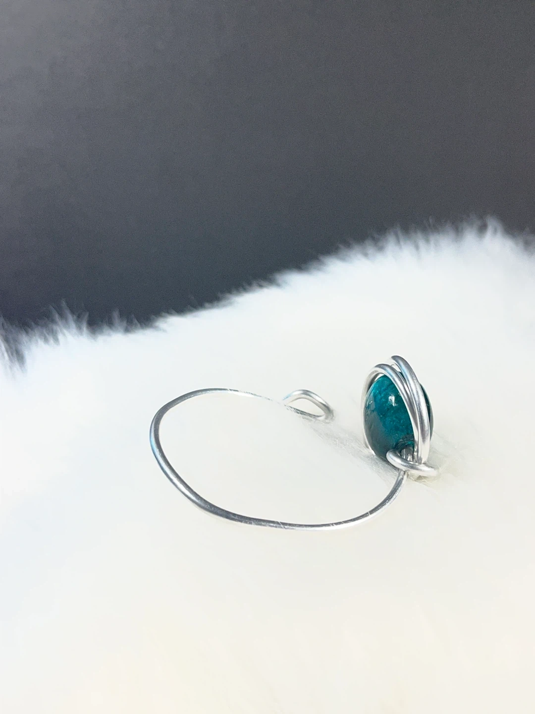 This cuff bracelet features a large, striking blue glass cabochon securely wrapped in silver-toned wire. It's designed to fit most wrists.