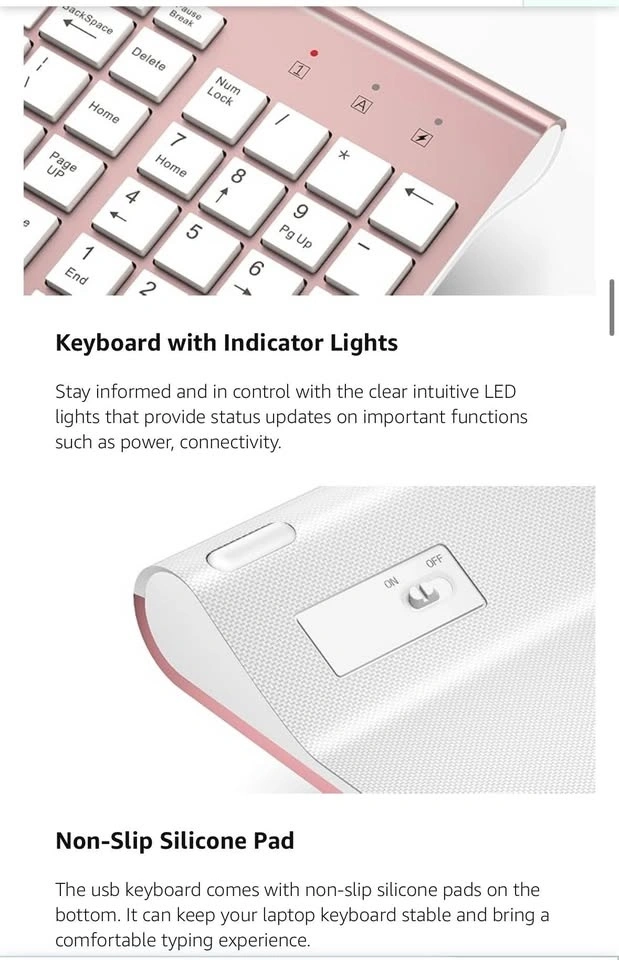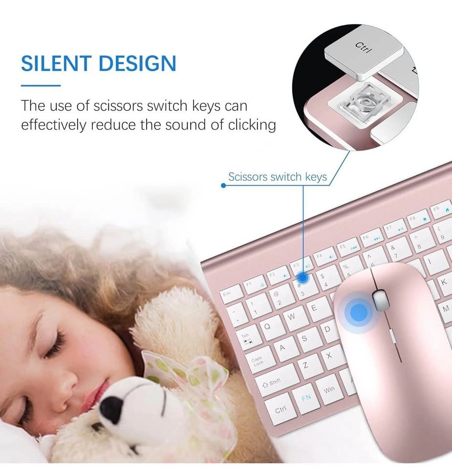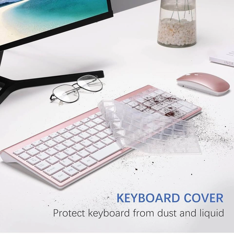 New brand Wireless Keyboard and Mouse Ultra Slim Combo, TopMate 2.4G Silent Compact USB 2400DPI Mouse and Scissor Switch Keyboard Set with Cover, Batteries Included, for PC/Laptop/Windows/Mac- Rose Gold White. The wireless keyboard is 14.55x5.5x0.8in (37x14x2cm) with an ultra-thin ABS plastic body.