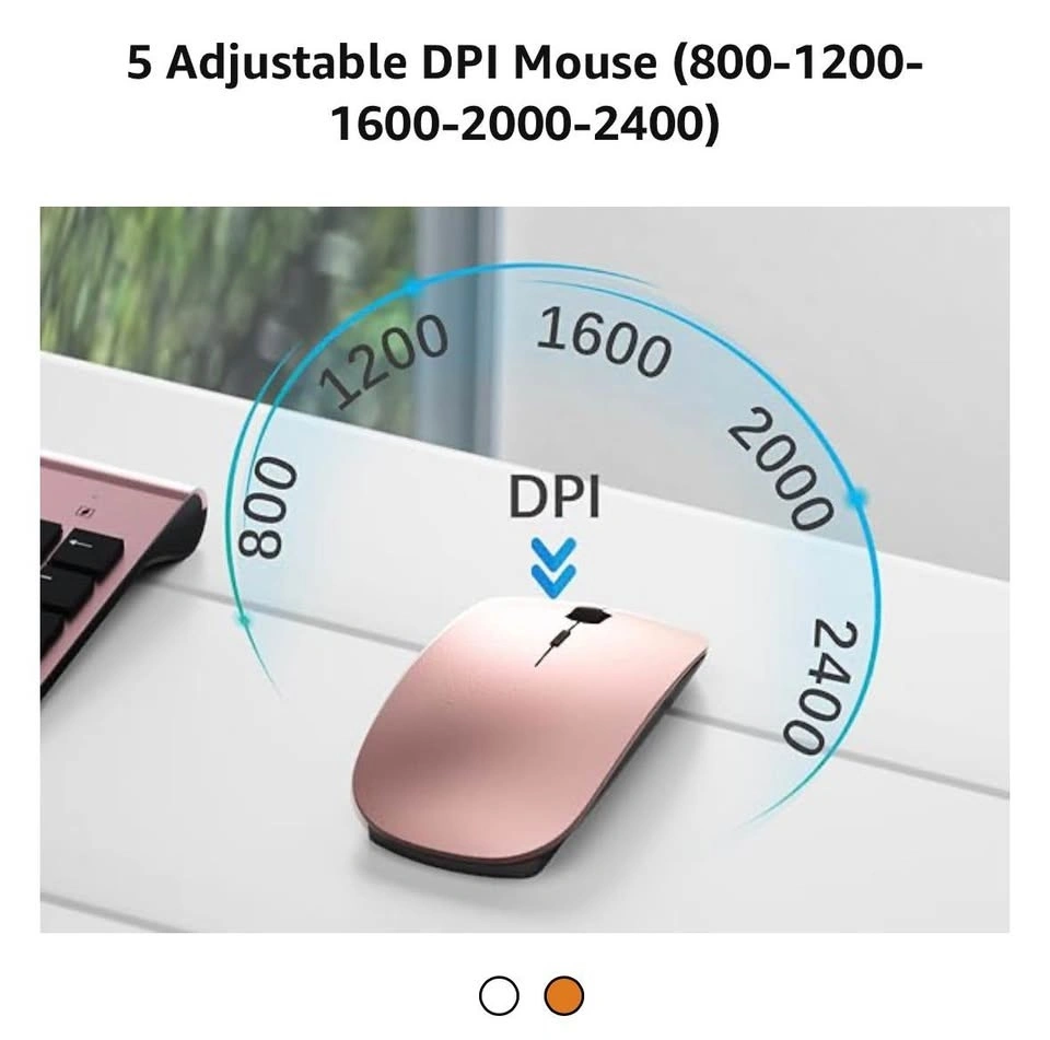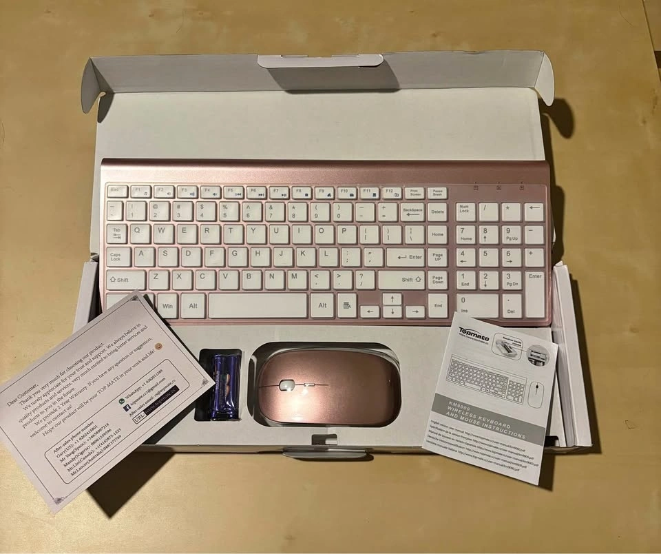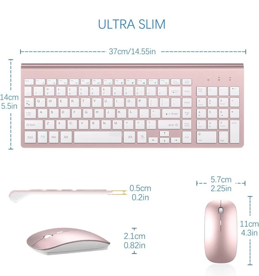 New brand Wireless Keyboard and Mouse Ultra Slim Combo, TopMate 2.4G Silent Compact USB 2400DPI Mouse and Scissor Switch Keyboard Set with Cover, Batteries Included, for PC/Laptop/Windows/Mac- Rose Gold White. The wireless keyboard is 14.55x5.5x0.8in (37x14x2cm) with an ultra-thin ABS plastic body.