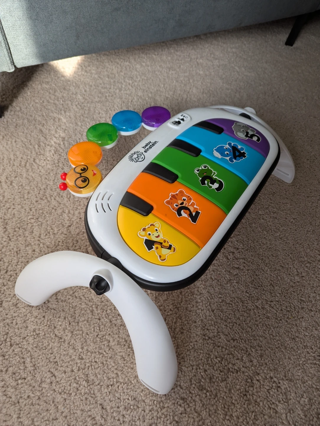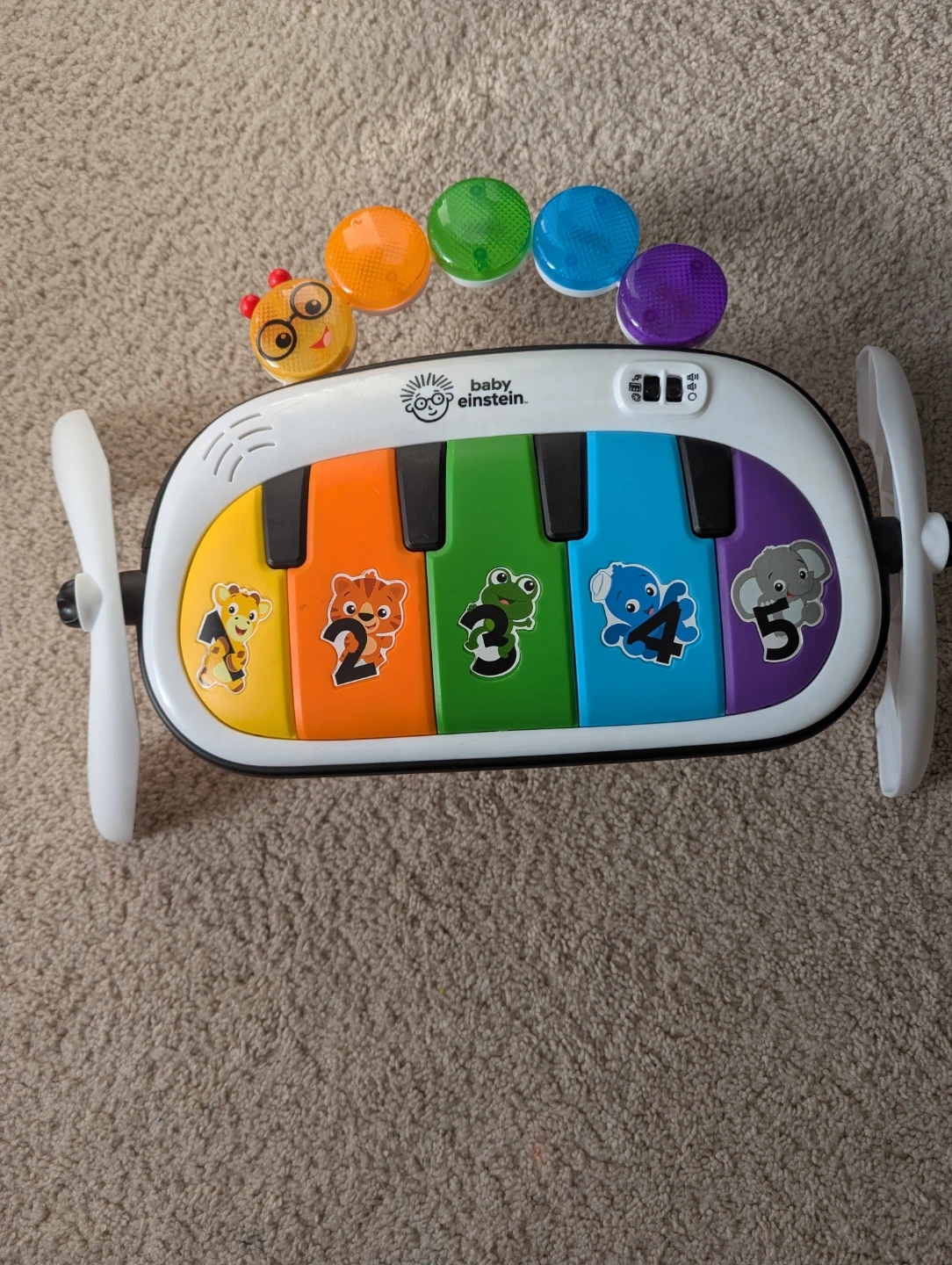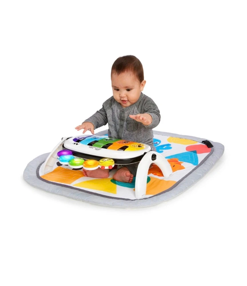 This Baby Einstein musical piano features colourful keys with animal graphics. It has lights and sounds to entertain little ones. Perfect for tummy time and play.