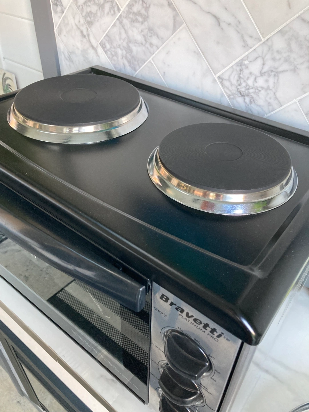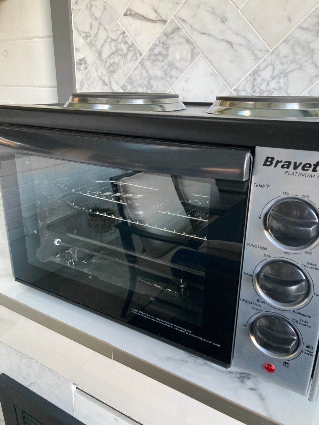 A convenient counter-top oven, and 2 burner stove ideal for smaller spaces. Comes with two cooktop burners above. The oven has multiple function settings. You'll enjoy the peaceful feeling of fresh, warm food on the table. Great as a second oven in the shed /garage to reduce the heat inside in the summer or for camping with electricity. Rotisserie bakes etc