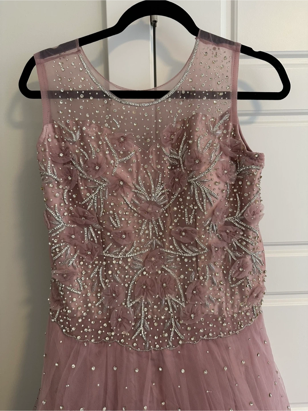 Beautiful pink formal gown with intricate beadwork and floral embellishments on the bodice and scattered on the tulle skirt. Sleeveless with a sheer neckline. Perfect for special occasions!