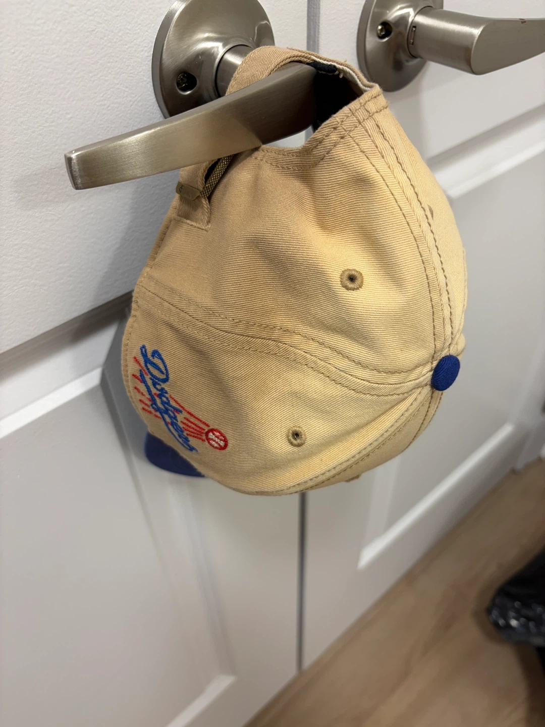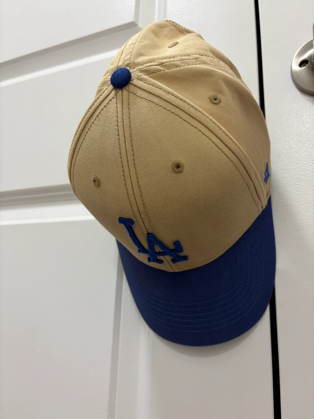 Khaki and royal blue Los Angeles Dodgers baseball cap. It's a '47 Brand fitted hat with embroidered team logo. Cotton material.