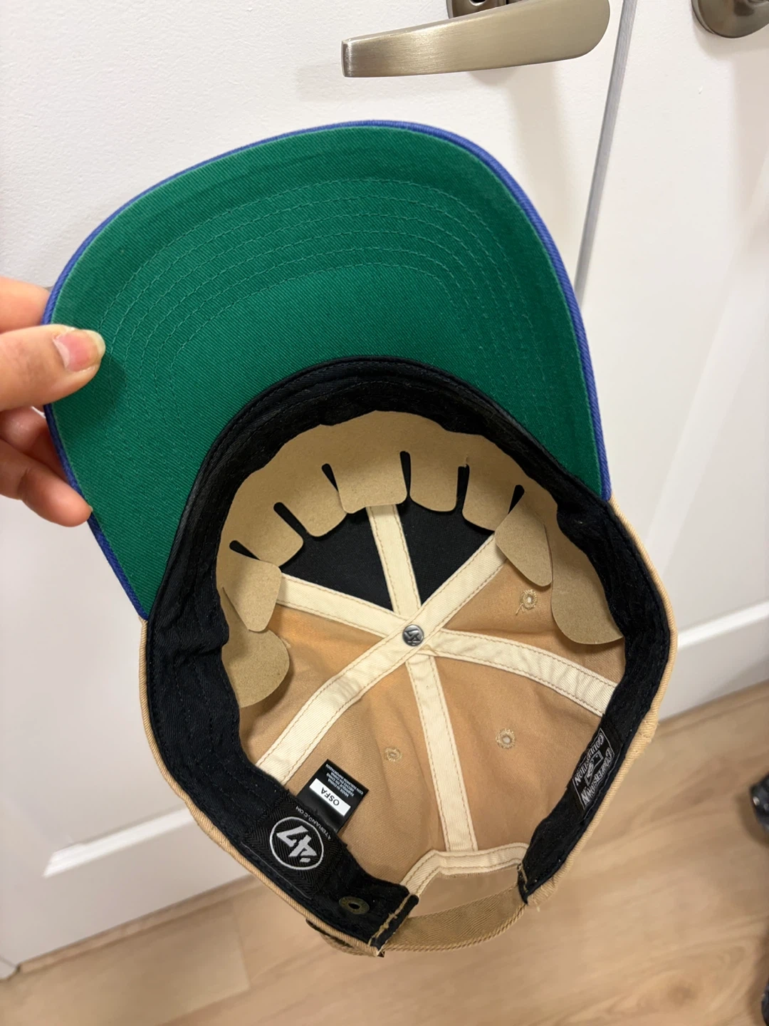 Khaki and royal blue Los Angeles Dodgers baseball cap. It's a '47 Brand fitted hat with embroidered team logo. Cotton material.