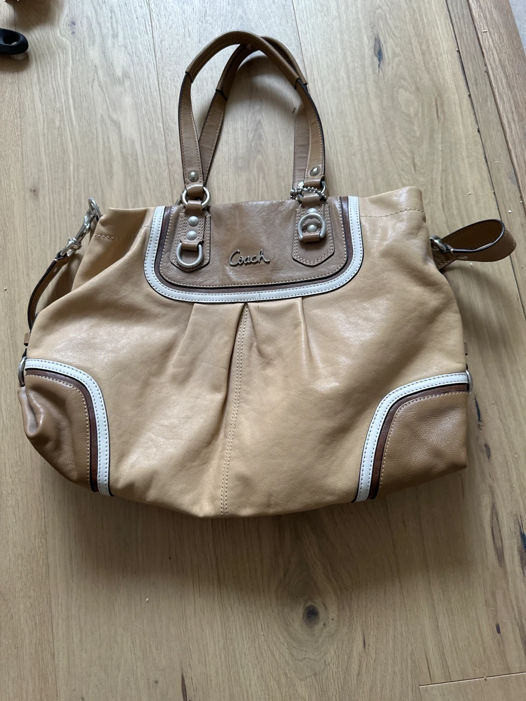 This is a tan Coach shoulder bag with brown and white trim details. It's made of leather. The bag has two top handles and a detachable shoulder strap. It's a stylish accessory for everyday use.