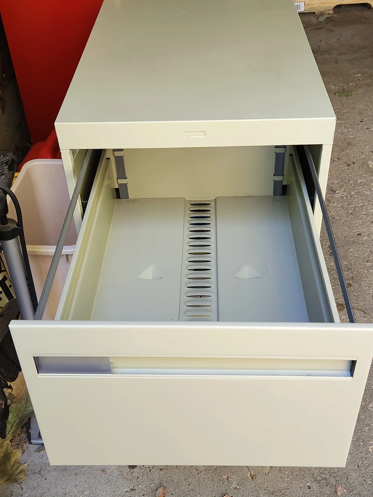 Selling a sturdy metal filing cabinet with two drawers. Great for organizing your documents and keeping your workspace tidy. It's in good condition and ready to use in your home or office