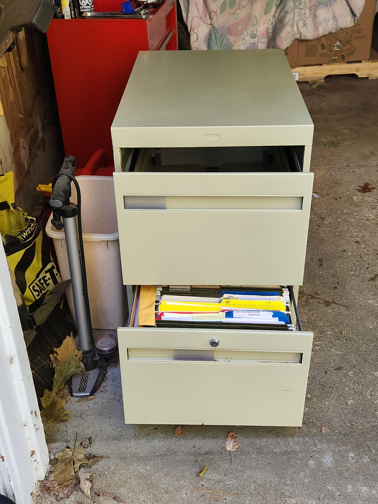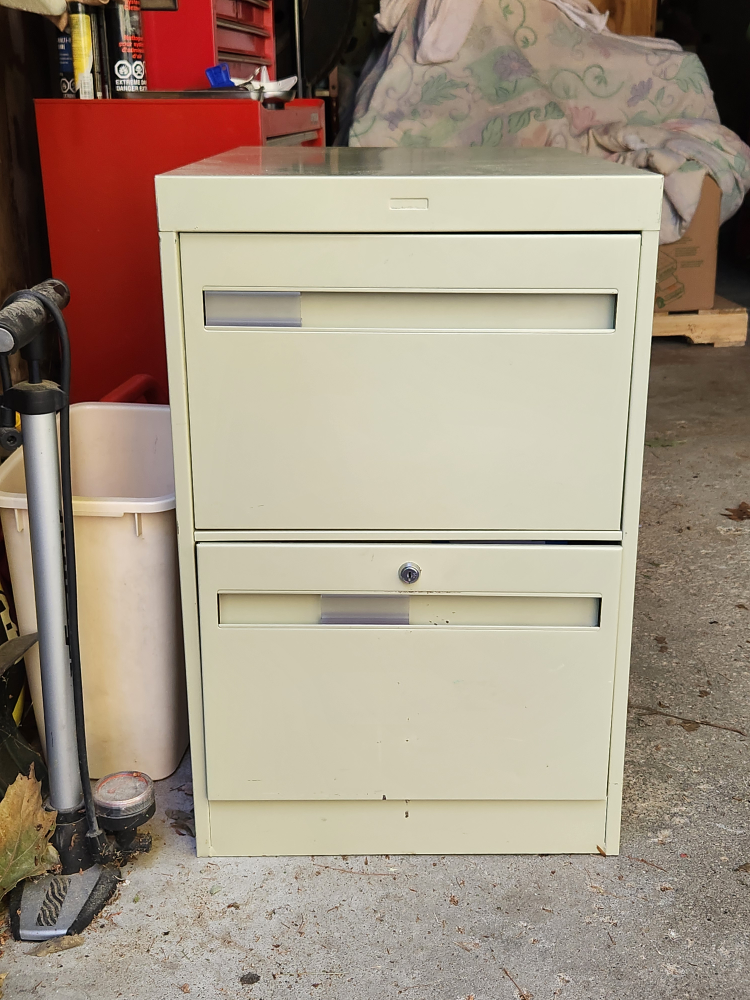 Selling a sturdy metal filing cabinet with two drawers. Great for organizing your documents and keeping your workspace tidy. It's in good condition and ready to use in your home or office