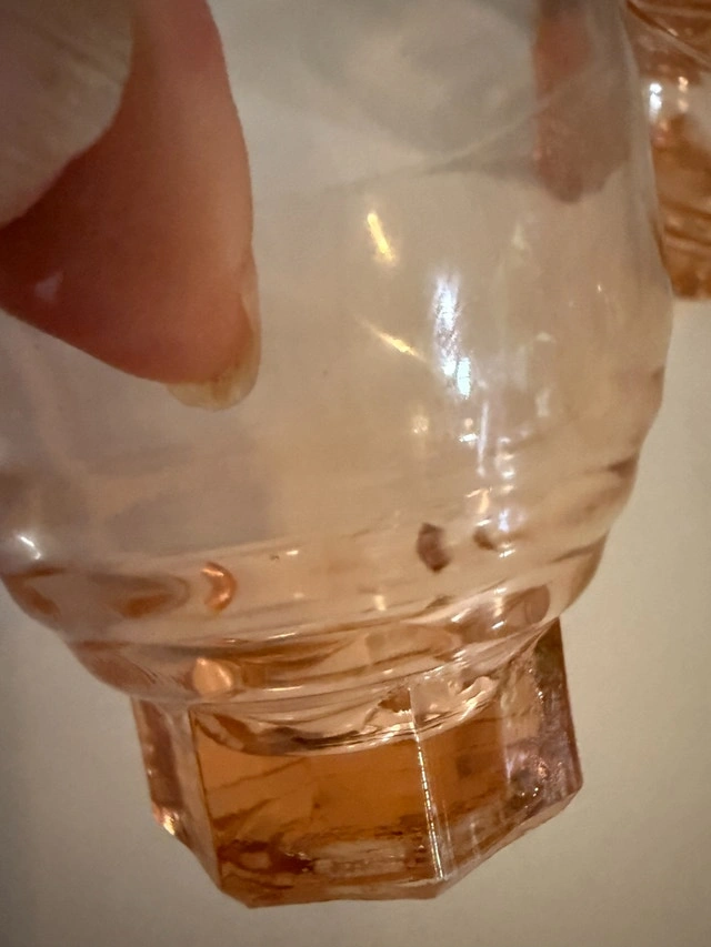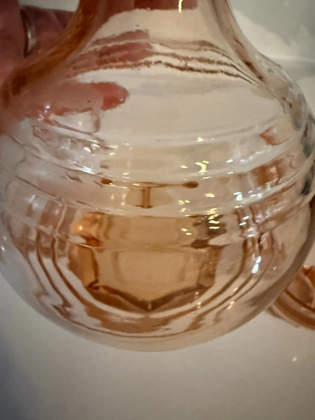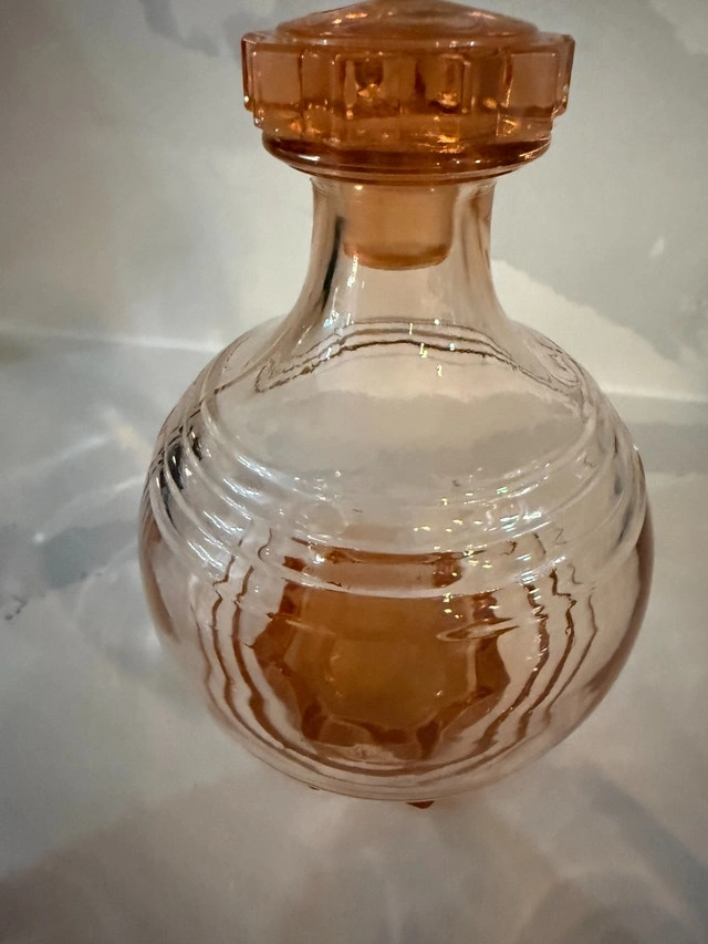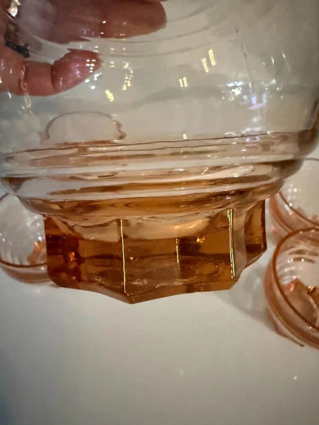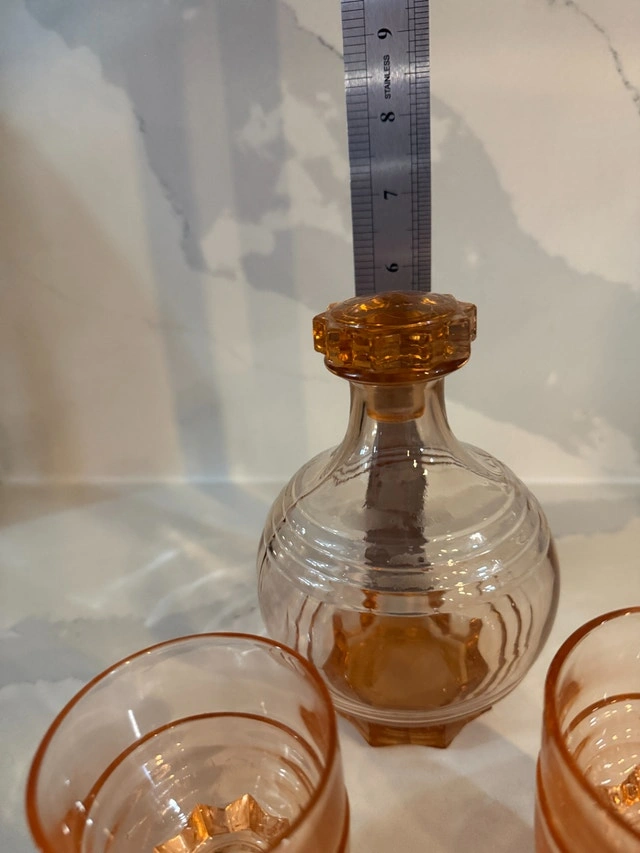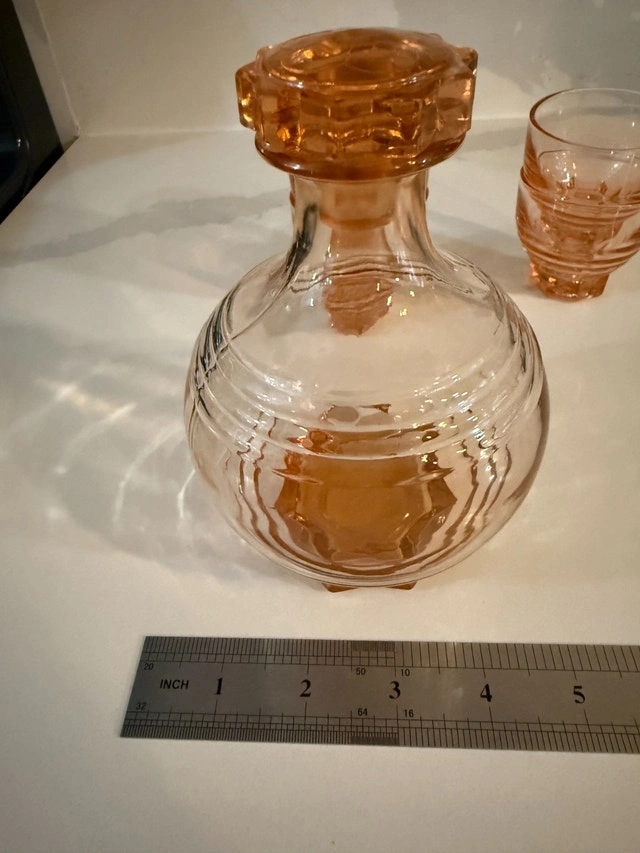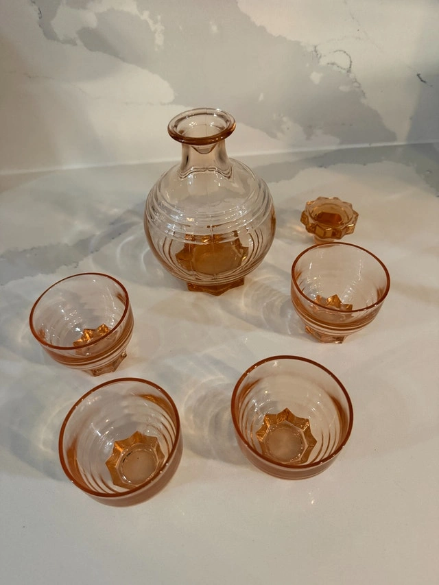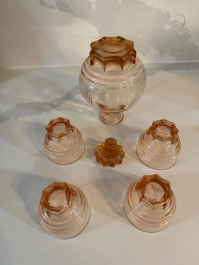 French Art deco from the 50's. Decanter with stopper and four shot glasses. Made of molded pink glass, often referred to as "Rosaline" glass or "peach" glass. Excellent condition - no cracks or nicks. Refer to pictures. Cash accepted.