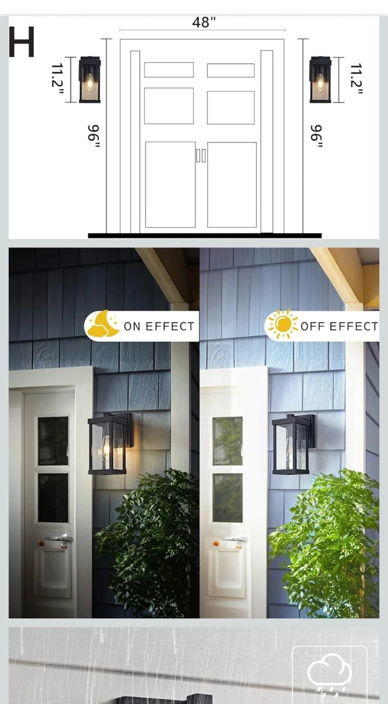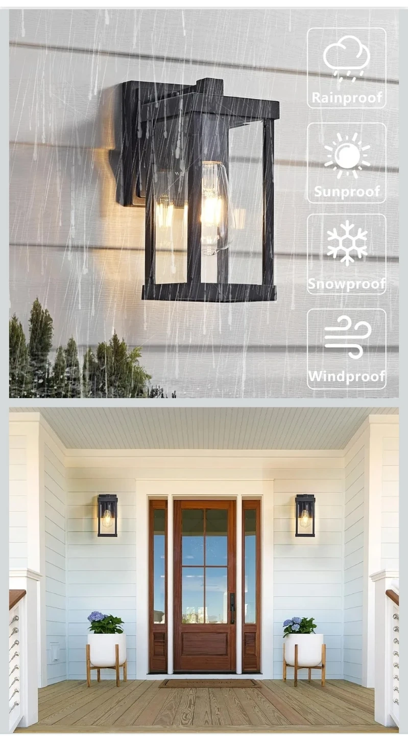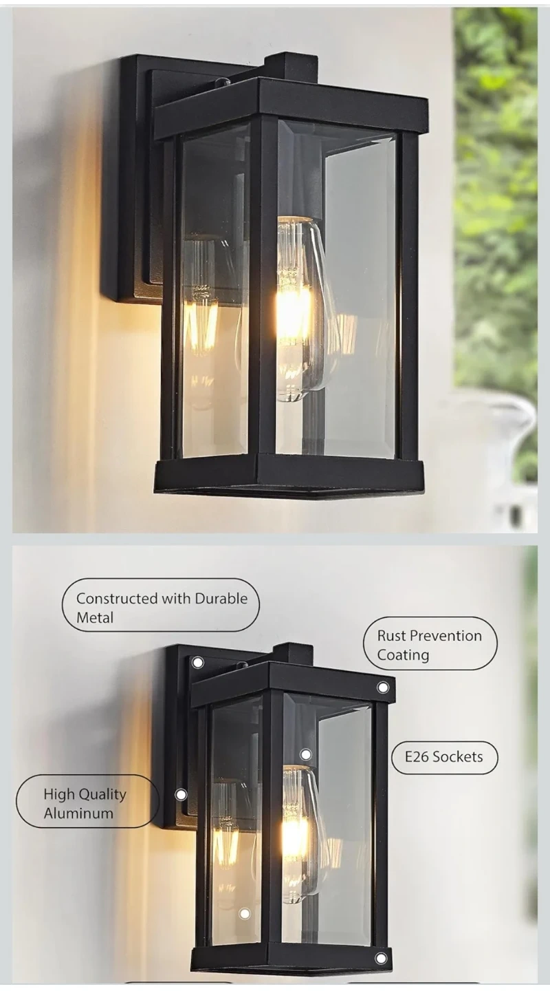 This outdoor wall lantern is made with high-quality aluminum and toughened glass. It's rainproof, snowproof, and heat resistant, with an anti-rust coating for durability. Easy to install, it's designed for exterior lighting applications.