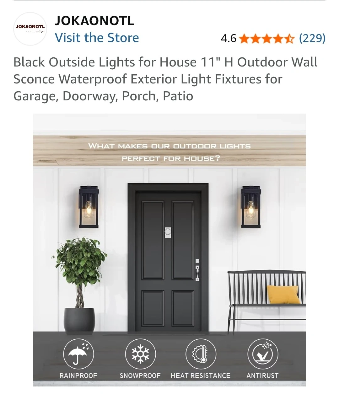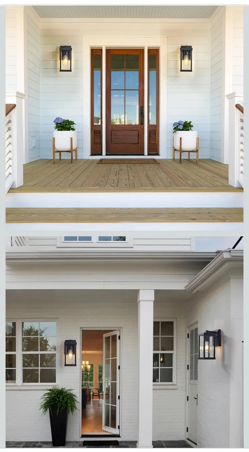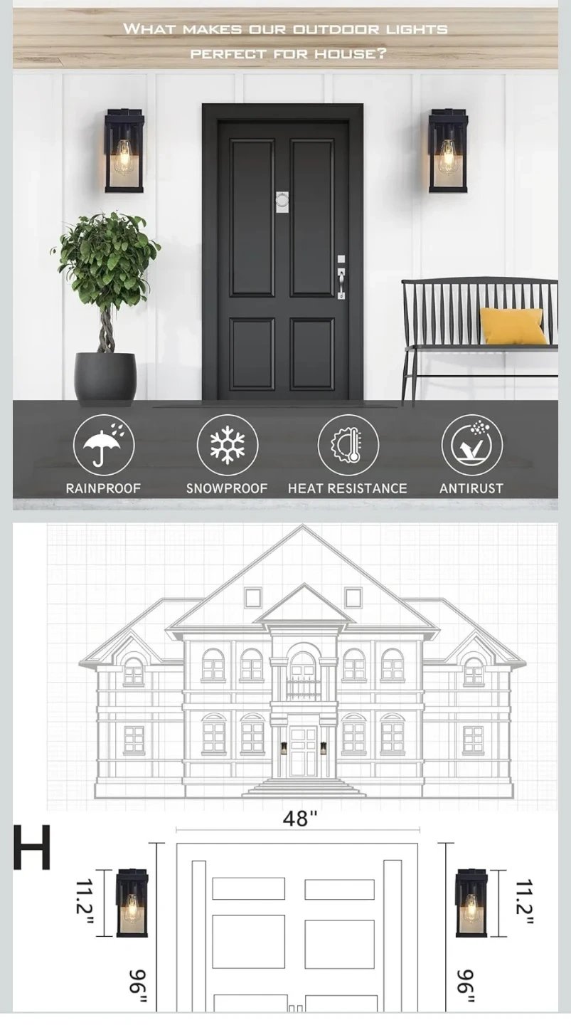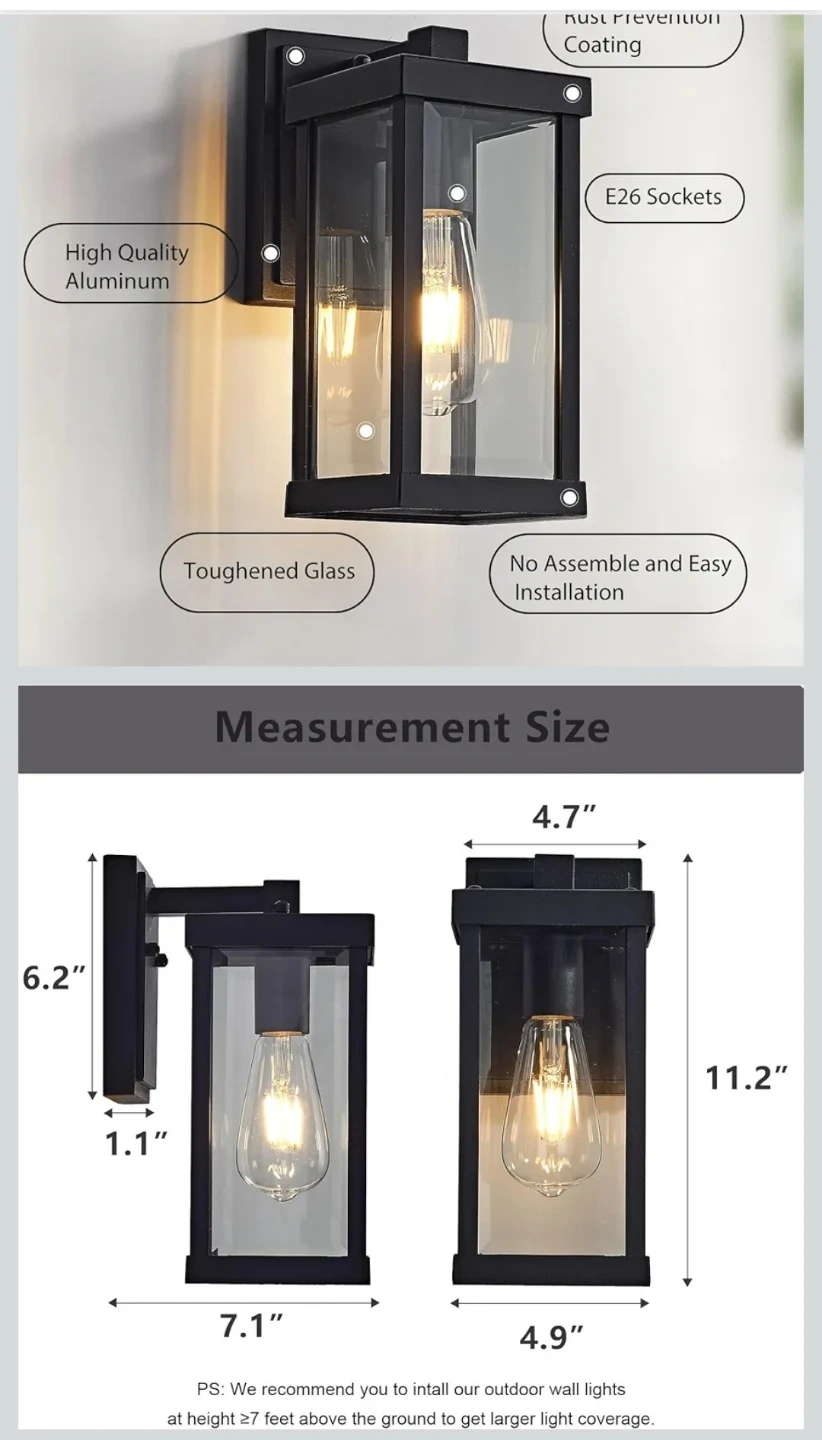 This outdoor wall lantern is made with high-quality aluminum and toughened glass. It's rainproof, snowproof, and heat resistant, with an anti-rust coating for durability. Easy to install, it's designed for exterior lighting applications.