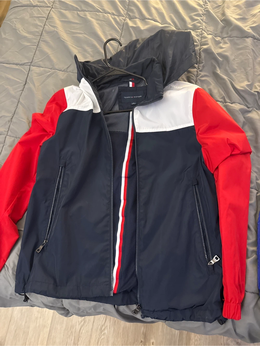 Tommy Hilfiger colour-blocked jacket with a hood. It's a men's jacket featuring navy, red, and white panels. It has zippered pockets and a full zip closure.