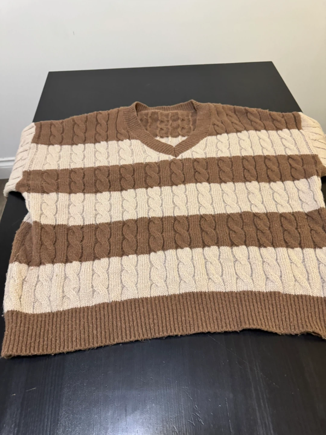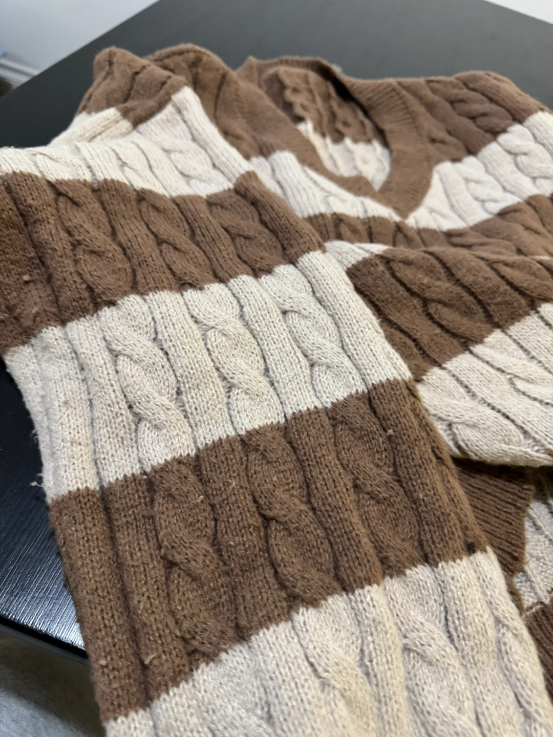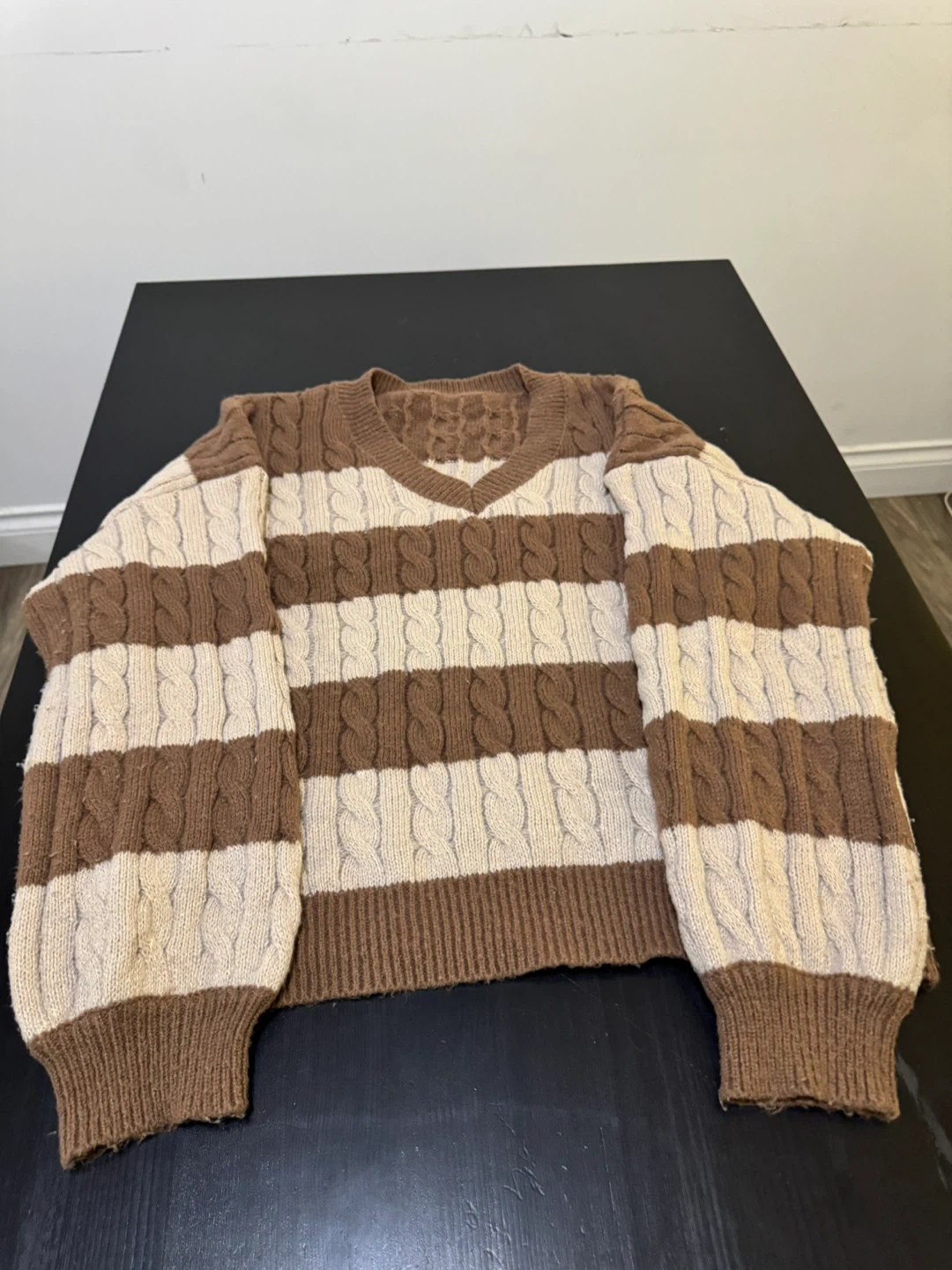 Cozy V-neck sweater with alternating brown and cream stripes. Features a classic cable knit pattern throughout. Perfect for adding a touch of warmth and style to your outfit!