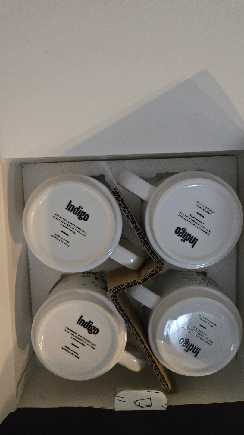 Brighten up your mornings with this charming set of four Indigo mugs, each adorned with unique and whimsical sayings to add a touch of fun to your coffee or tea routine! This set is in like new condition, and ready to find a new home.