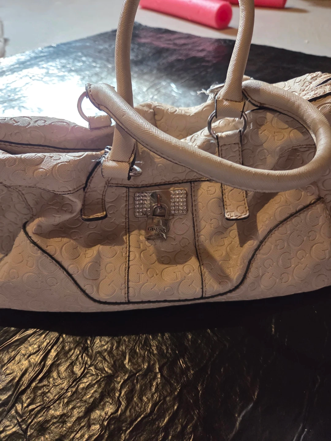 This is a cream-coloured Guess satchel handbag with a prominent all-over "G" monogram pattern. It features a secure clasp closure embellished with rhinestones and twin top handles. The interior appears to have multiple compartments.