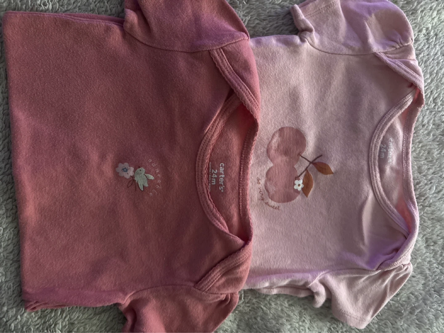 Seven adorable Carter's baby girls' bodysuits, perfect for everyday wear. Includes a mix of short-sleeve and long-sleeve styles with various cute prints like bunnies, dinosaurs, florals, and cherries. Made from soft cotton for baby's comfort. All the T shirts are Sizes 24 months.