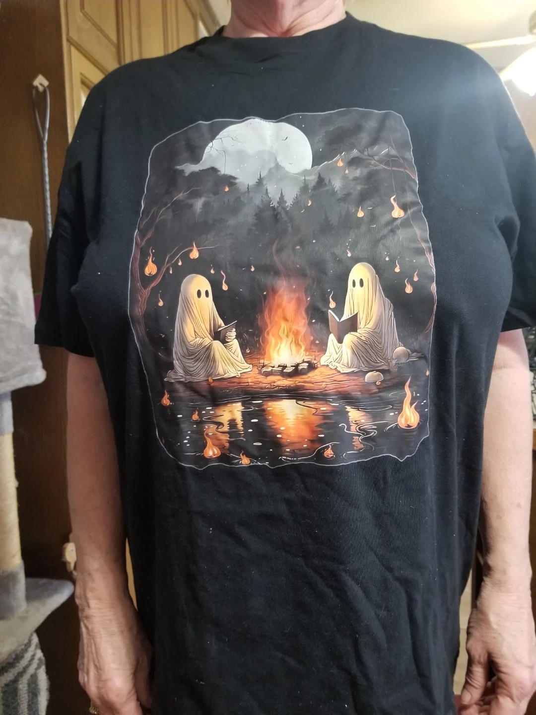 This is a black t-shirt featuring a graphic of two ghosts reading by a campfire under a full moon. The shirt is made of a comfortable fabric. It's perfect for Halloween or any spooky enthusiast!