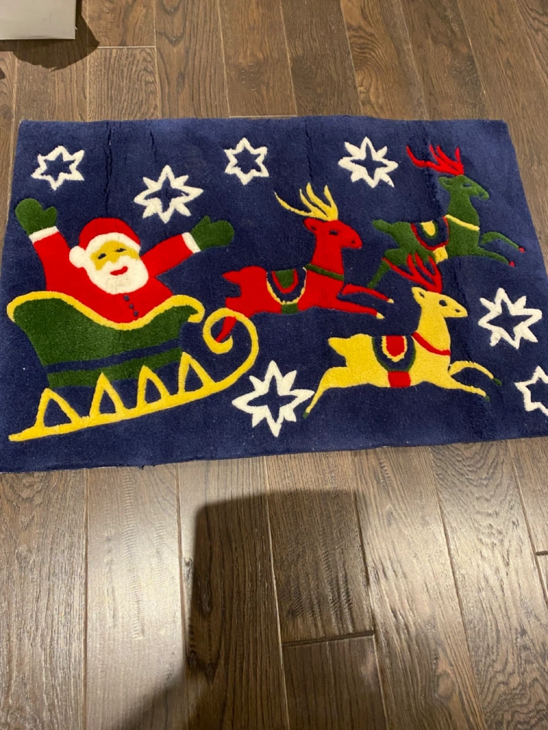 Festive rug featuring Santa in his sleigh with reindeer and stars! Perfect for adding a touch of holiday cheer to your home during the Christmas season. 3 x 2 feet