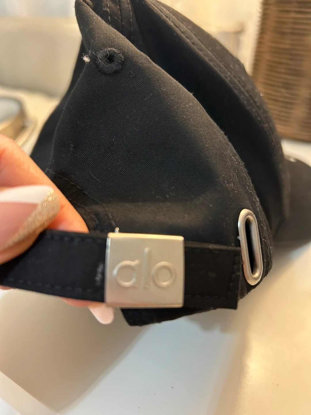 Alo black baseball cap. Features an adjustable strap with metal buckle. Simple, classic design for everyday wear.