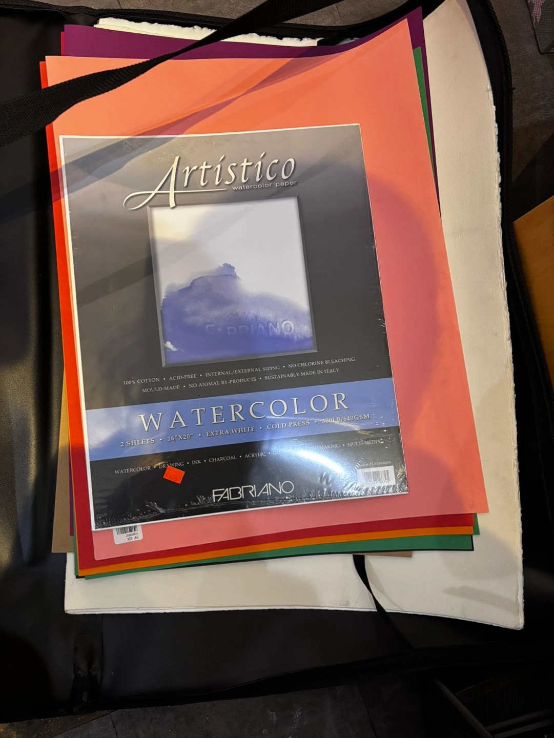 Various sizes and colours of pastel, watercolour and drawing paper. Includes a pack of Fabiano Artistico watercolour paper still sealed.