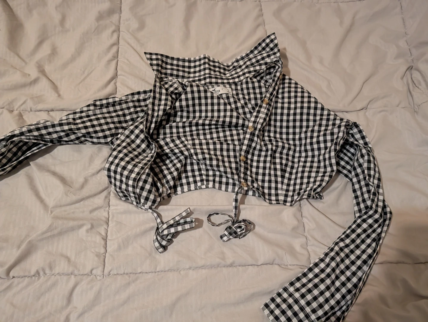 This Hollister crop shirt features a black and white gingham pattern. It's a size small with long sleeves and a tie detail at the hem. Button-up front.
