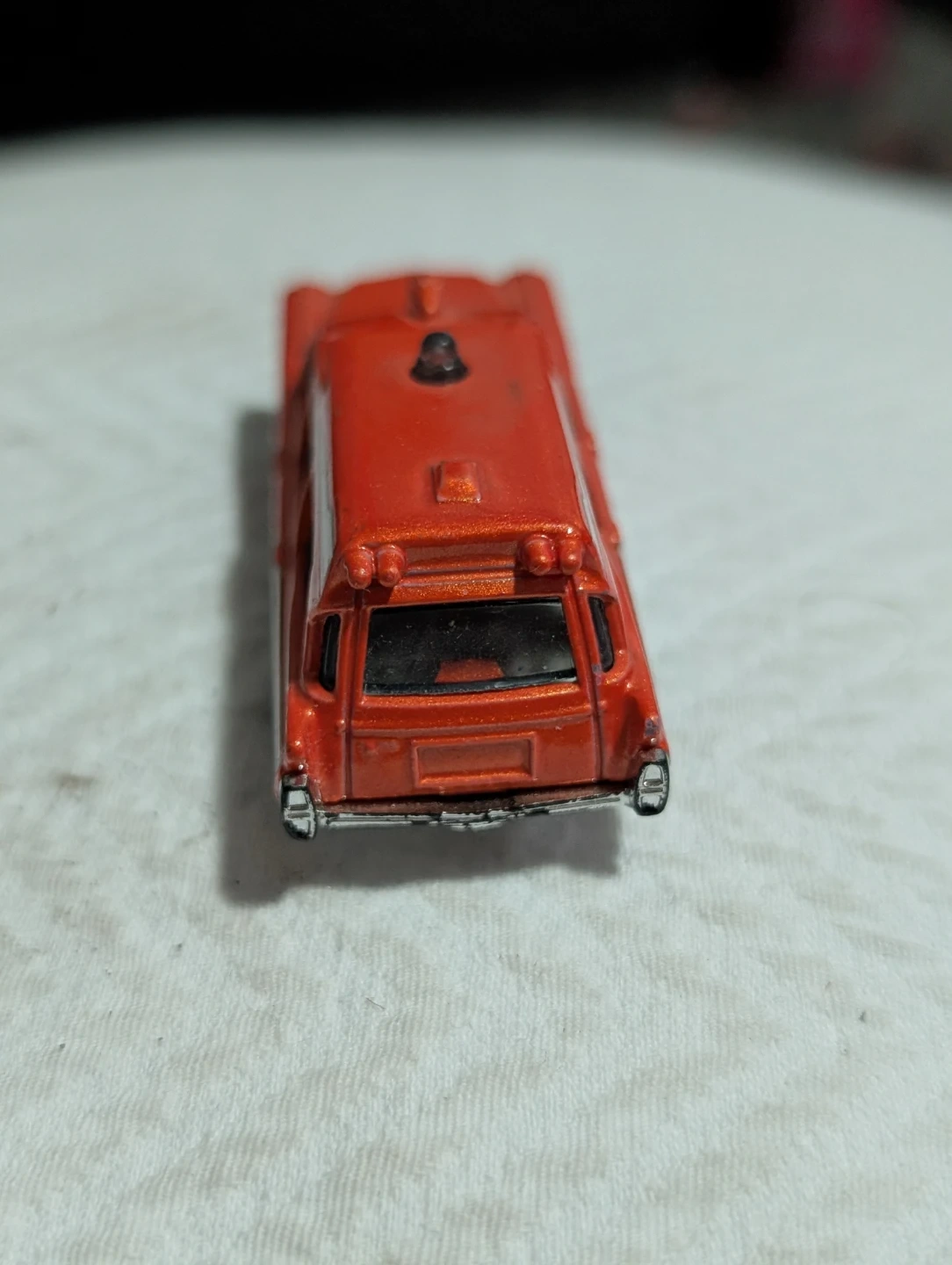 This is a small orange MBX ambulance toy car. It has realistic details like emergency lights and stripes on the side. Fun for imaginative play!