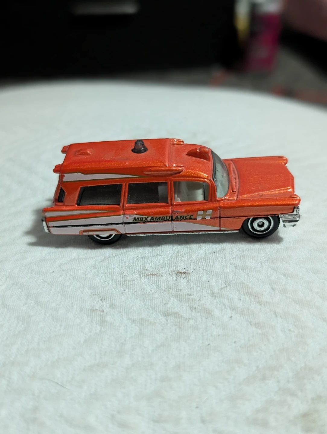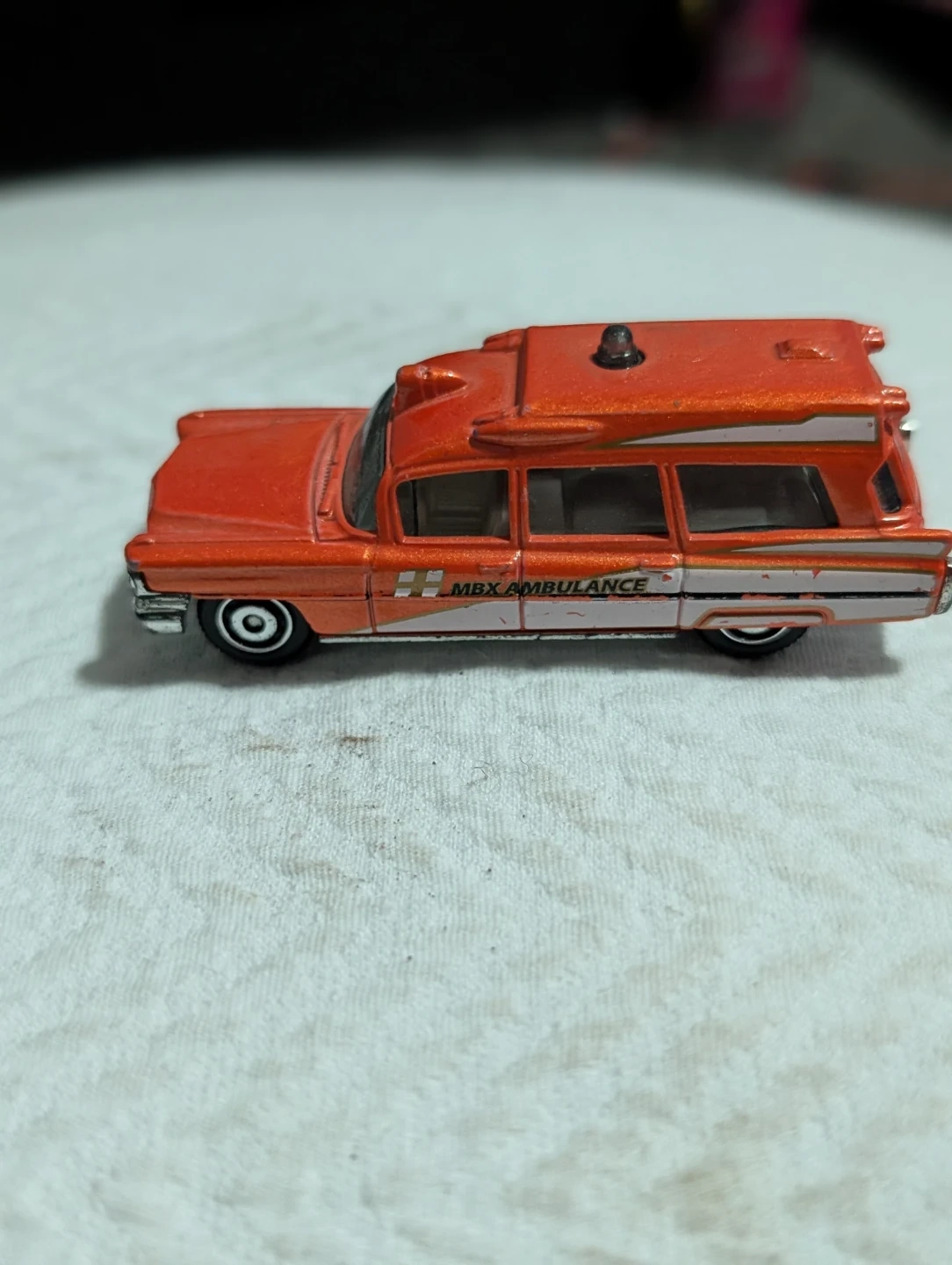 This is a small orange MBX ambulance toy car. It has realistic details like emergency lights and stripes on the side. Fun for imaginative play!