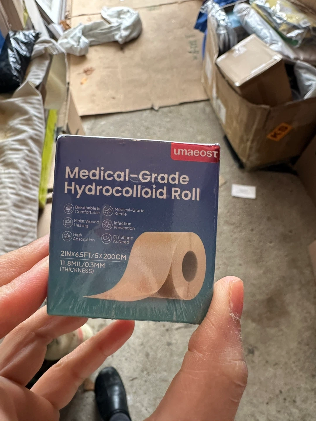 This is a roll of medical-grade hydrocolloid dressing. It's 2in x 6.5ft (5cm x 200cm) and 11.8mil/0.3mm thick. It offers high absorption and infection prevention.
