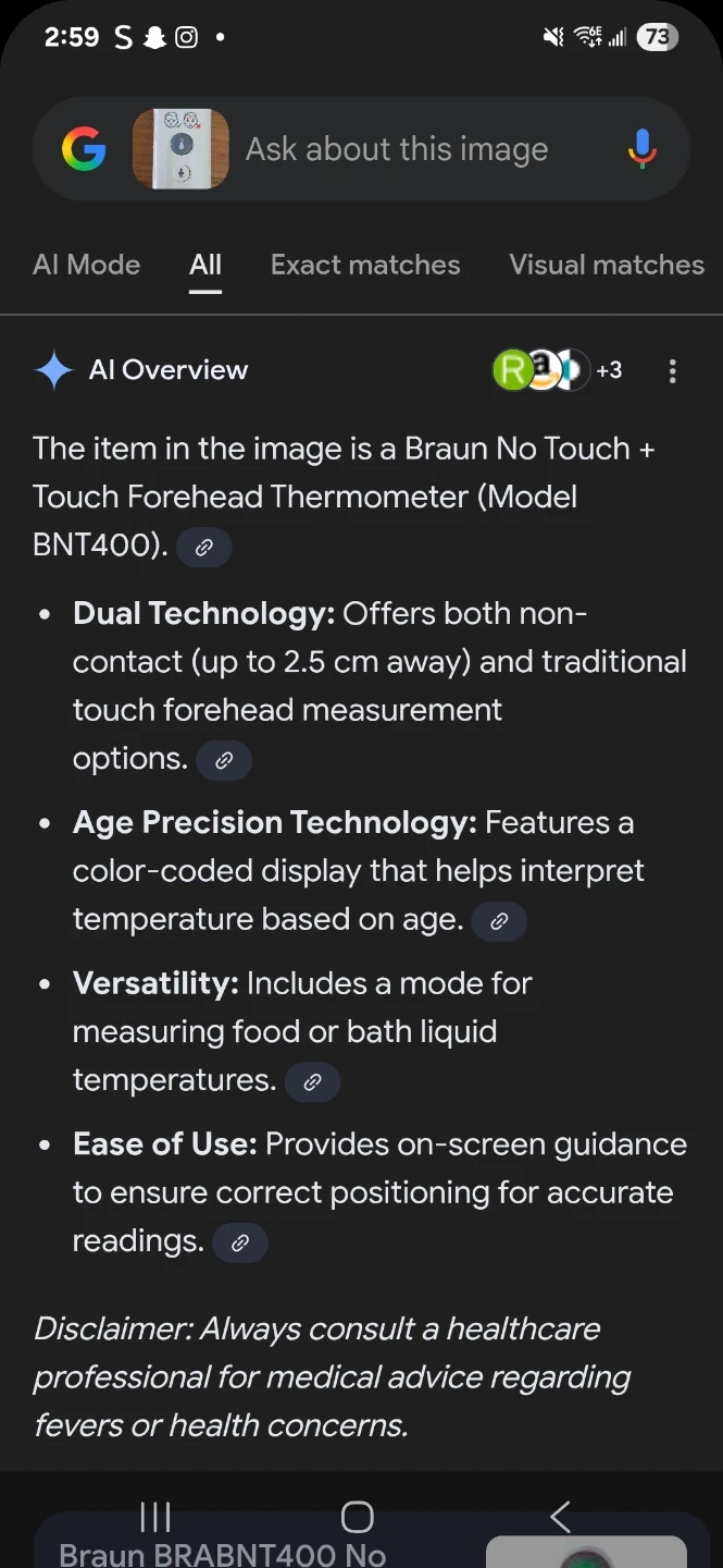 Like new Reliable Braun thermometer here. Has dual tech for no-touch or regular forehead temps. Super useful for babies or even checking bath water/food temps. Age Precision tech helps understand readings better. Easy to use with on-screen guides. Great for keeping track of temps.