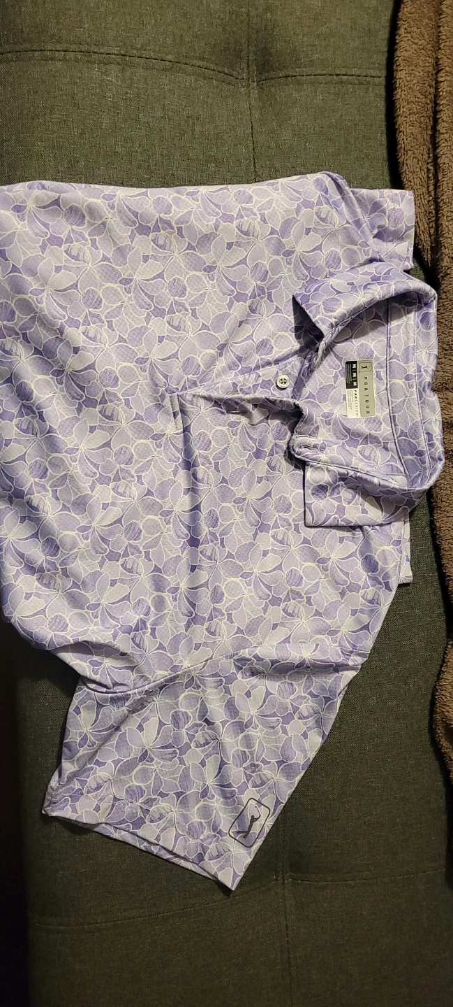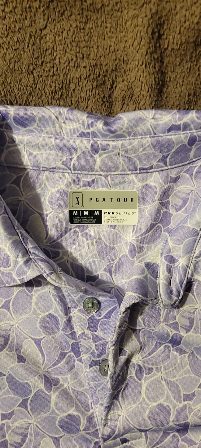 PGA TOUR Pro Series golf polo shirt in size medium. It's a short-sleeve button-up with a floral pattern. Features moisture-wicking fabric.