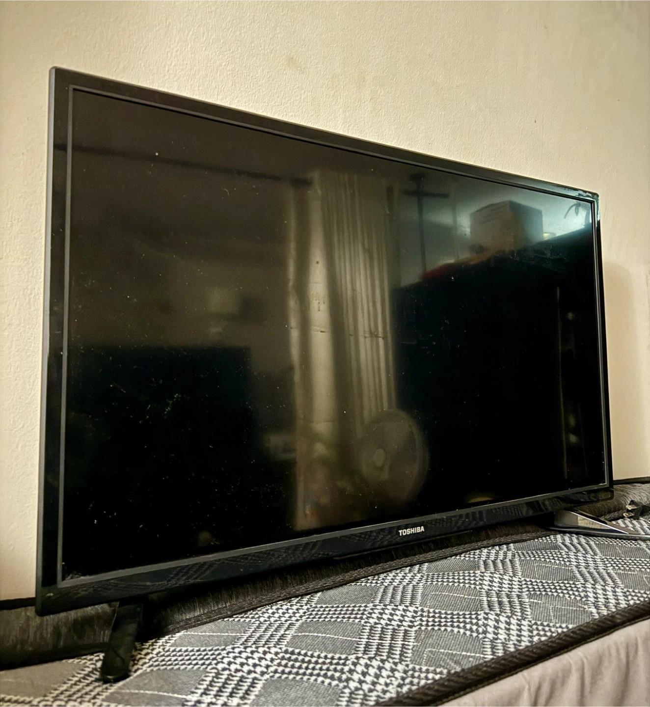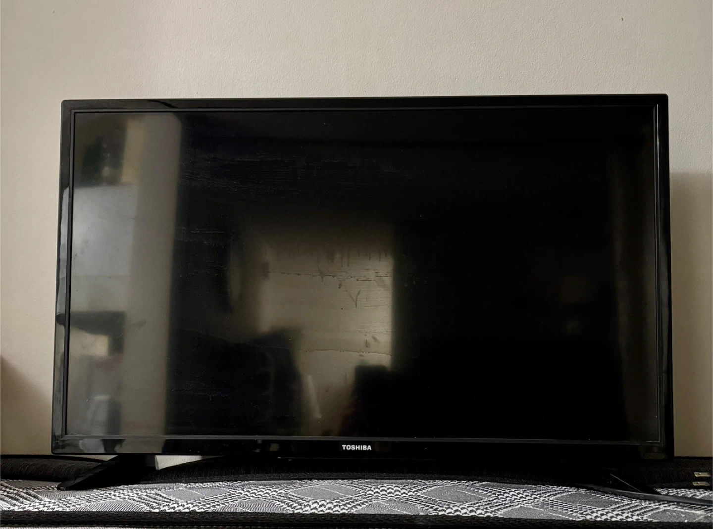 Toshiba 32-inch HD television. Black, flat-screen display with remote. It's a standard TV for viewing shows and movies.