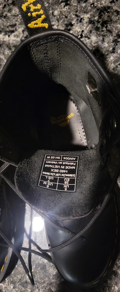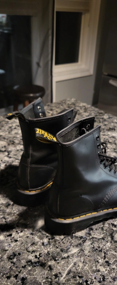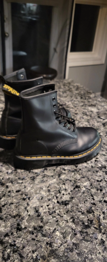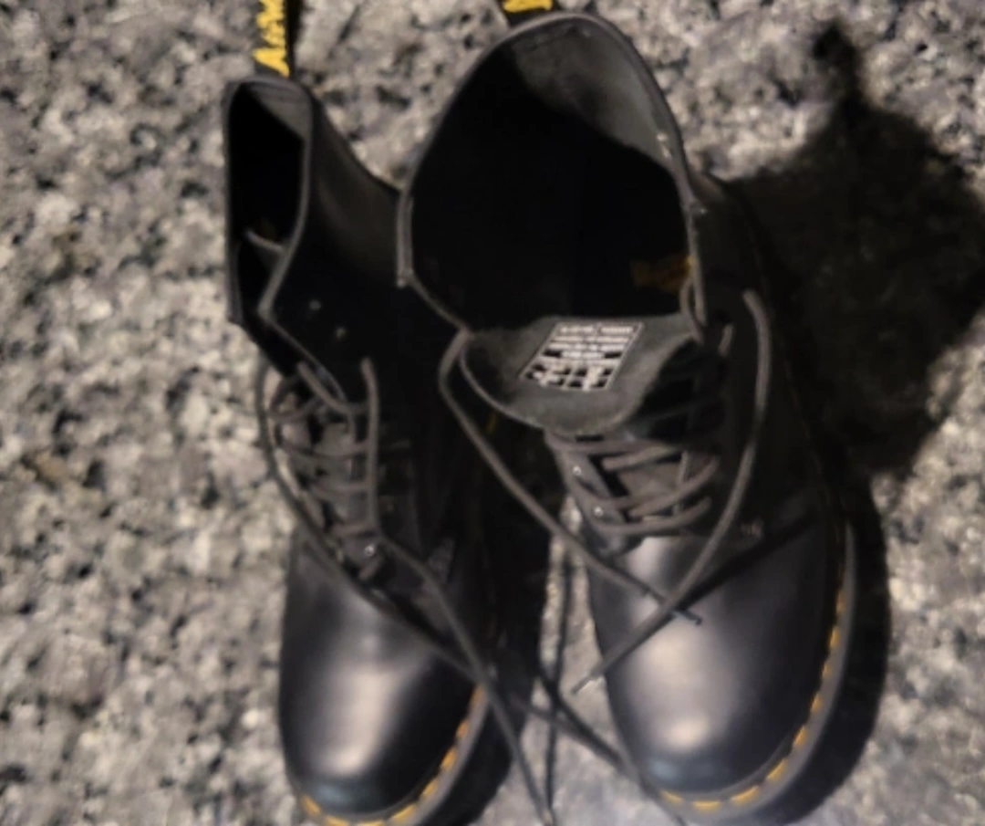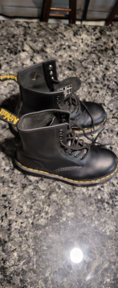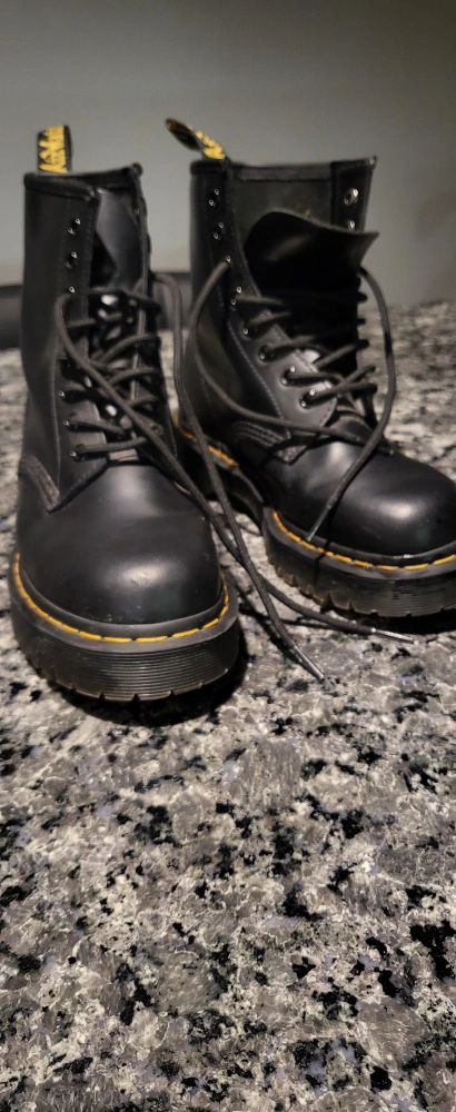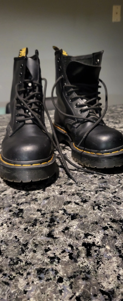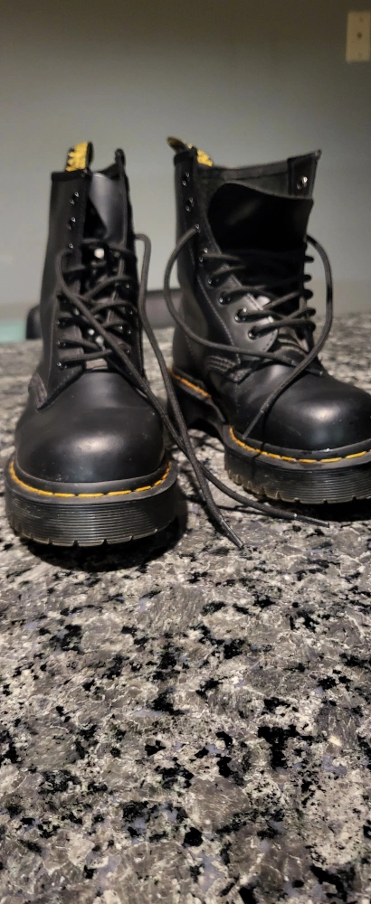 Black leather boots with yellow stitching, black laces, and a thick sole. Size 7 US. EU 38.