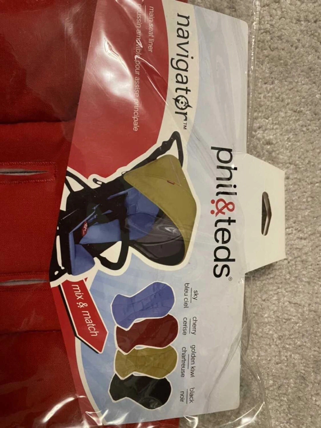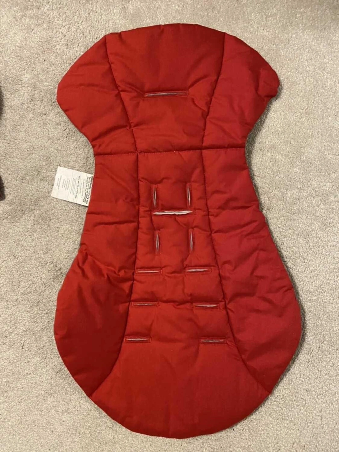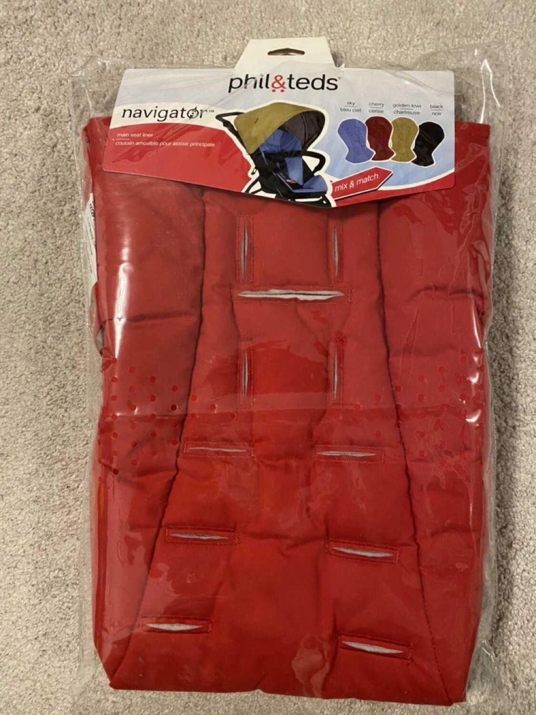 Phil & Ted’s universal stroller seat liner. Easy to clean and fits most strollers. Barely used, like new. Reversible. Red or khaki. Machine washable.