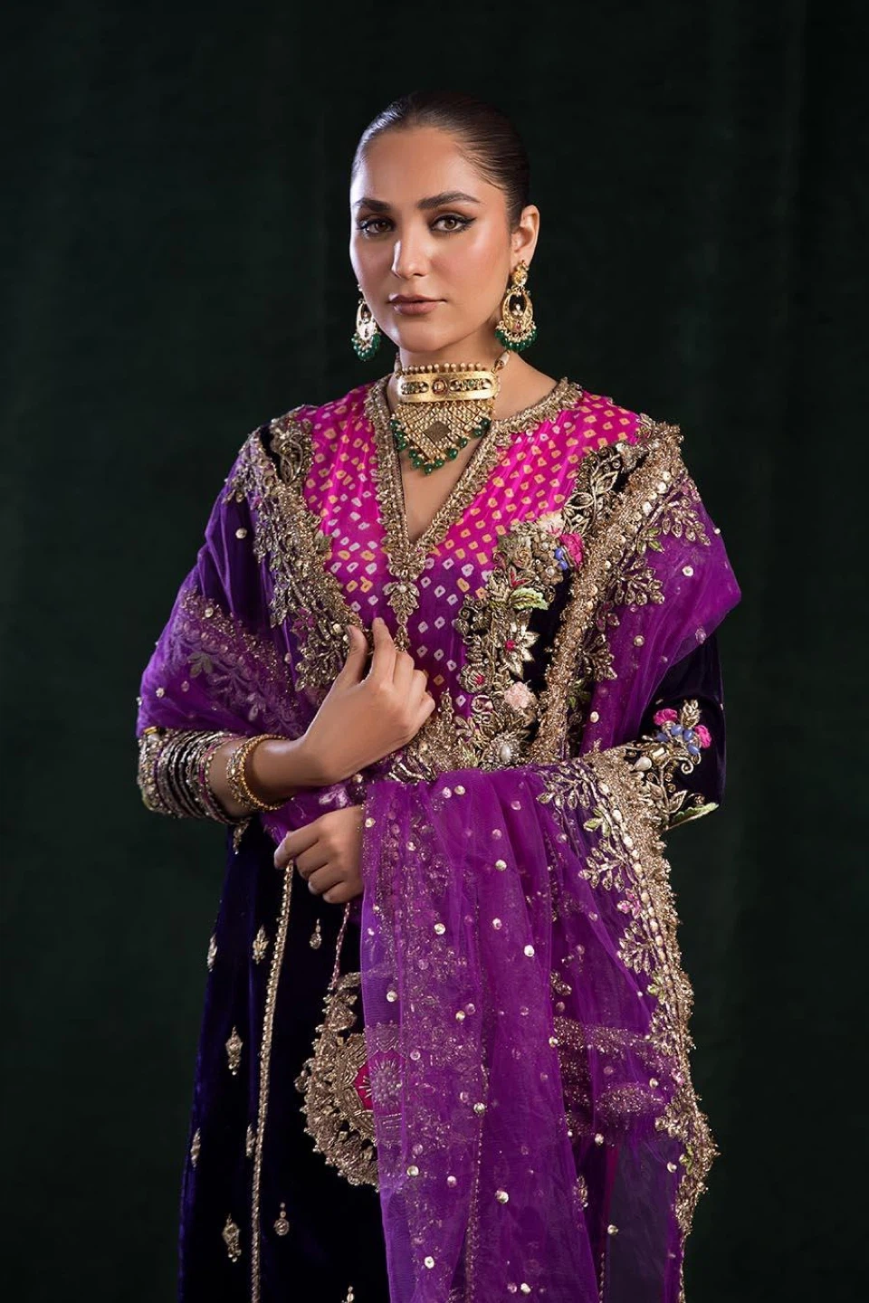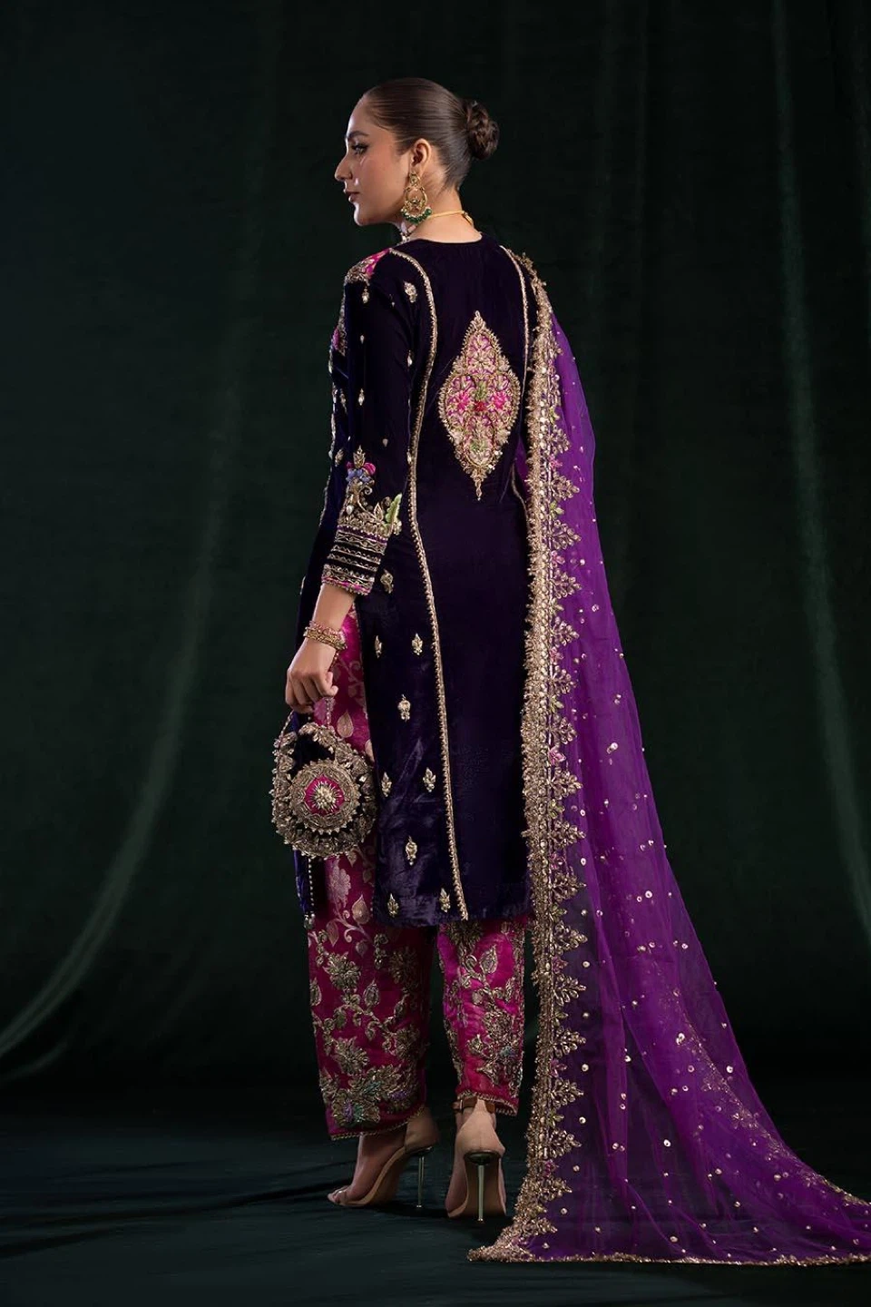 Beautiful purple velvet salwar kameez with intricate embroidery. Includes a matching dupatta and pants. Perfect for special occasions!