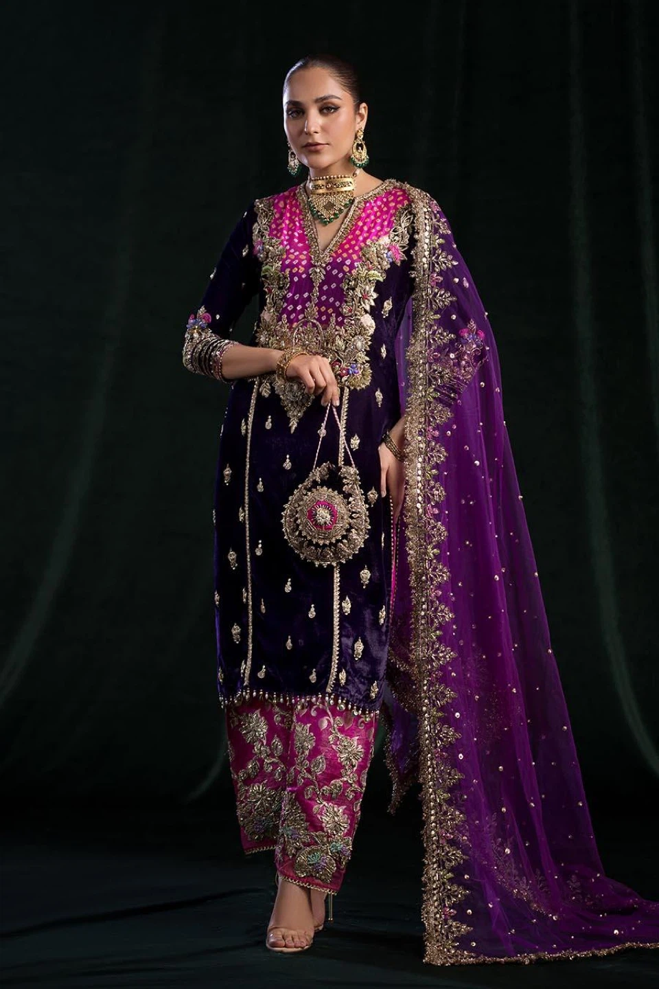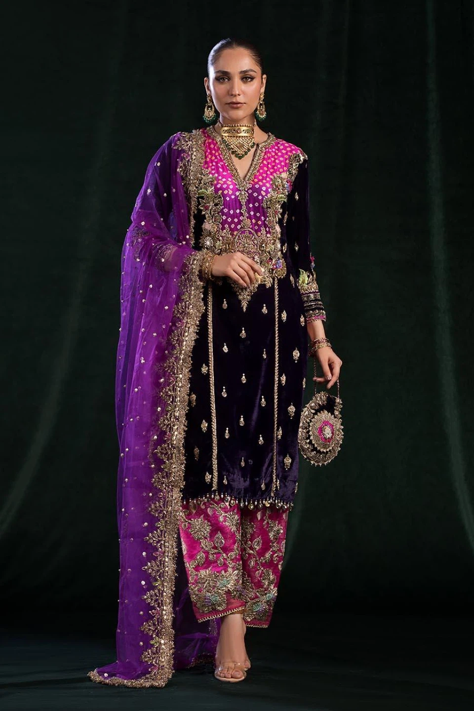 Beautiful purple velvet salwar kameez with intricate embroidery. Includes a matching dupatta and pants. Perfect for special occasions!