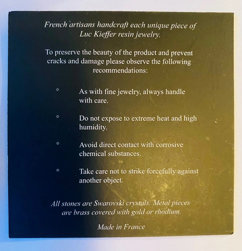 Elevate your look with this Luc Kieffer Paris Bagirio statement ring, a striking designer piece crafted from high-quality black resin and accented with elegant Swarovski crystals. This eye-catching ring blends modern artistry with French couture flair. Features: Brand: Luc Kieffer Paris Model: Bagirio Material: Black resin with Swarovski crystal accents Design: Sculptural, artistic statement silhouette Origin: Made in France Condition: New This piece is perfect as a bold fashion accent for evening wear, special occasions, or as a standout everyday accessory for lovers of unique designer jewelry. This is an authentic Luc Kieffer Paris piece handmade by French artisans. Each item is individually handcrafted using premium materials. According to the brand’s care card, all stones are genuine Swarovski crystals and the metal elements are brass plated with gold or rhodium. Please note: a matching necklace with pendant from the same brand is available separately and can be sold together with this ring.