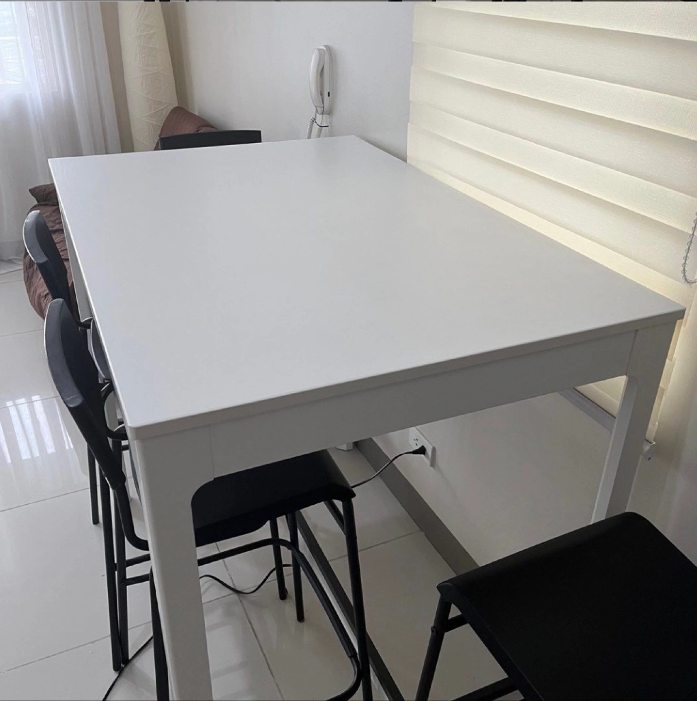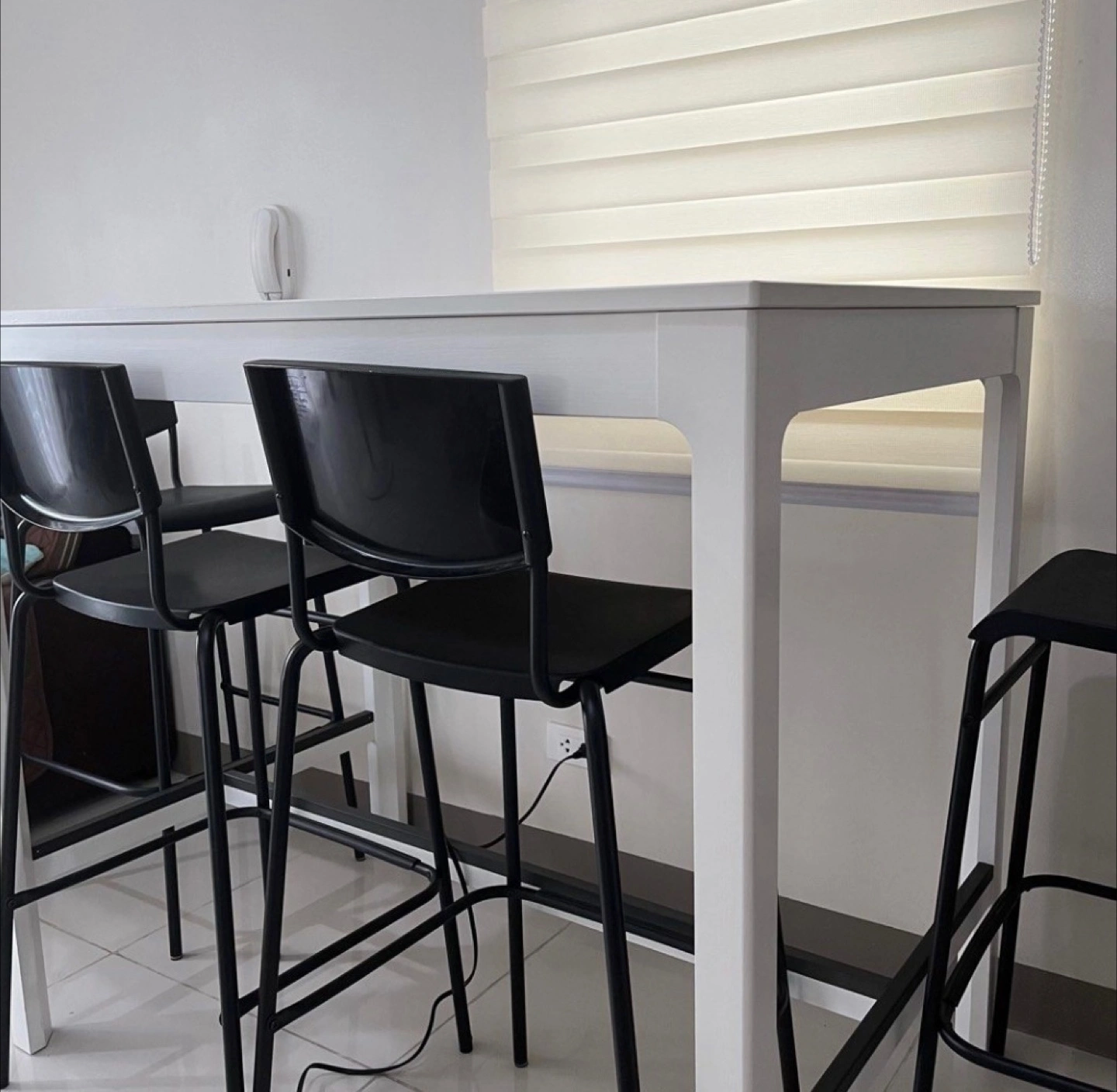 White bar table and 5 black bar chairs (only 4 on pictures but there are 5)—all in very good condition. Selling everything together.
