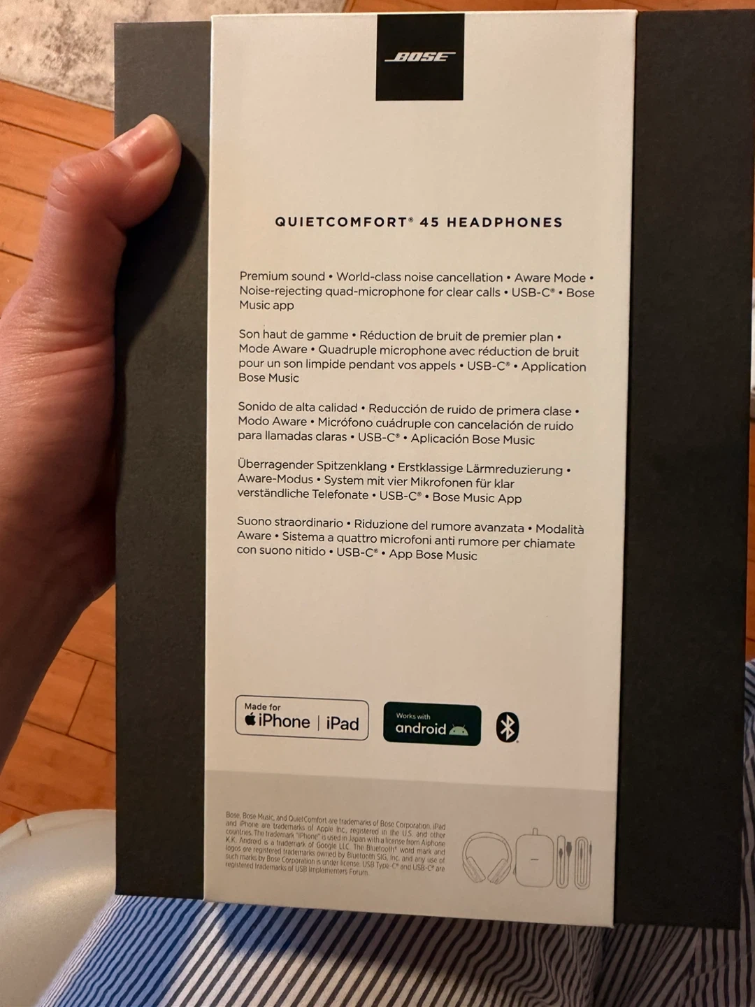 Bose QuietComfort 45 headphones with premium sound and world-class noise cancellation. It's noise-rejecting for clear calls and features USB-C charging and the Bose Music app. Works with iPhone, iPad, and Android devices.