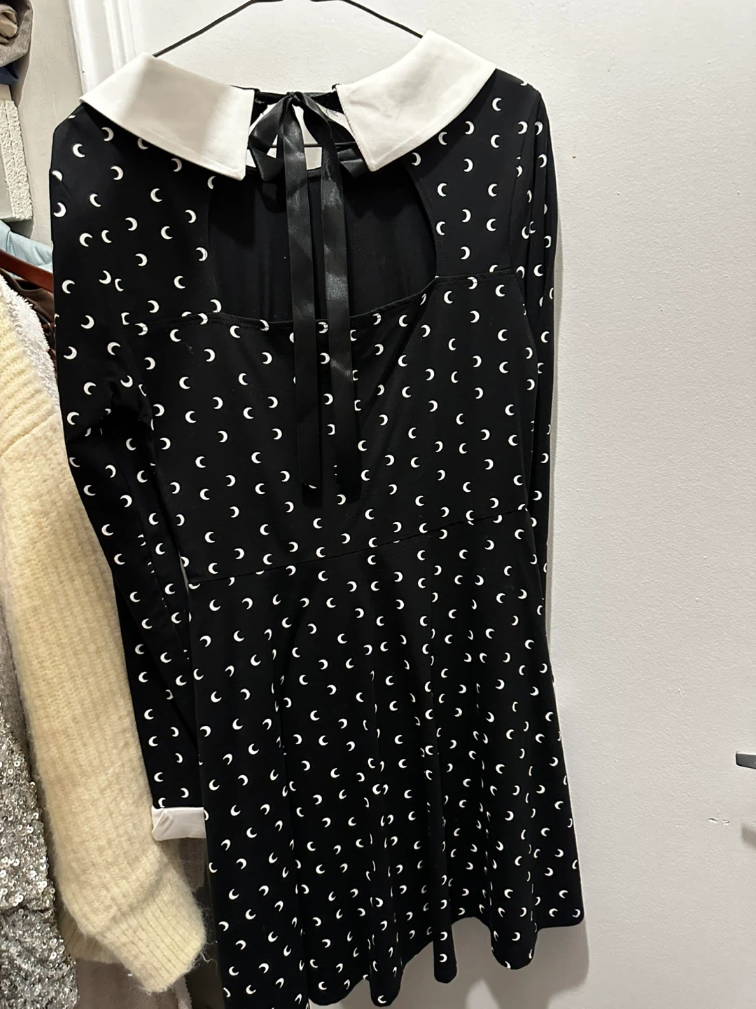 Selling a KILLSTAR Moon Child dress. It's black with a white collar and a moon pattern. It has a ribbon tie at the back.