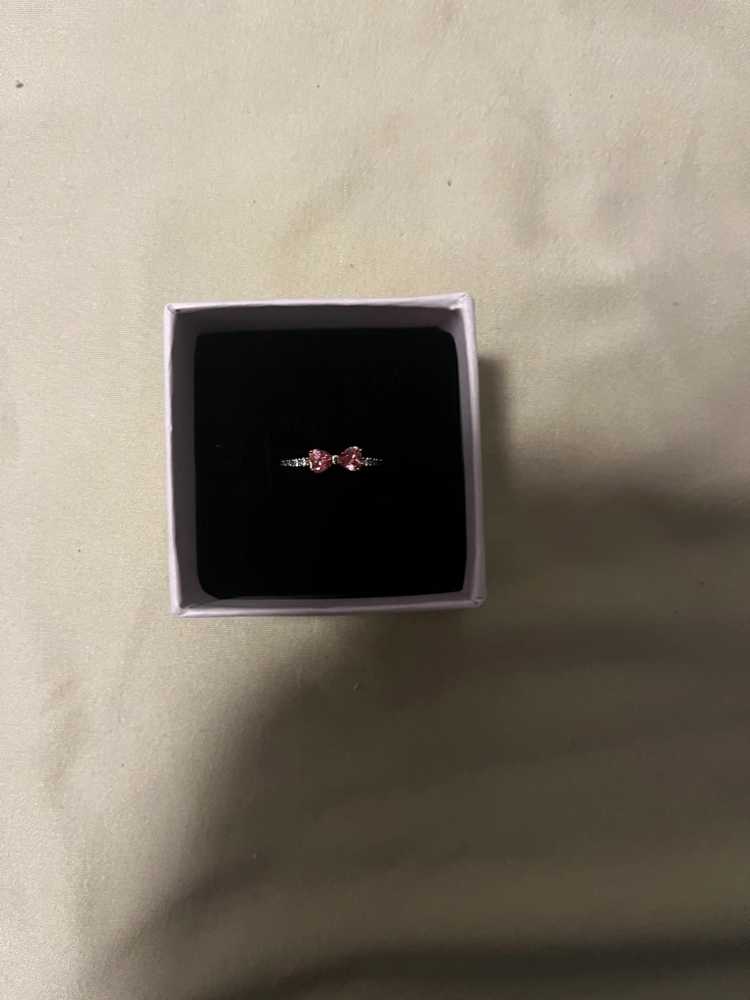This Pandora ring features a delicate pink bow design accented with small crystals. It comes in its original Pandora box, perfect for gifting as a valentine gift