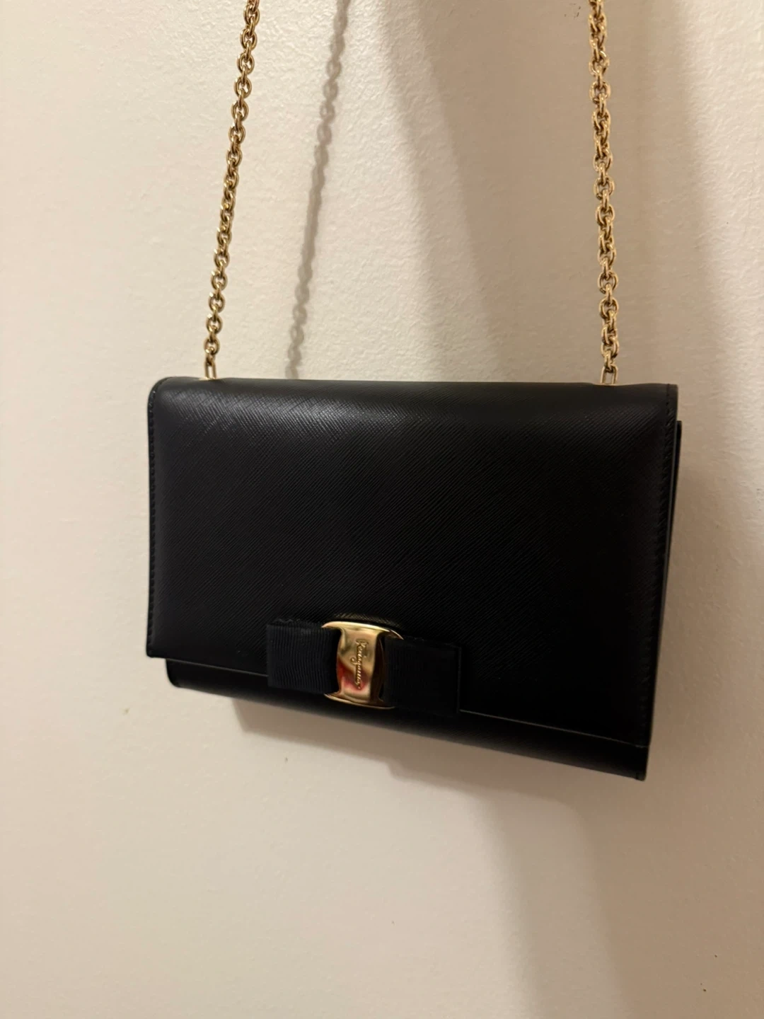 Beautiful black leather wallet on chain by Salvatore Ferragamo. It features their iconic Gancini clasp with gold hardware. It's compact yet practical for essentials.