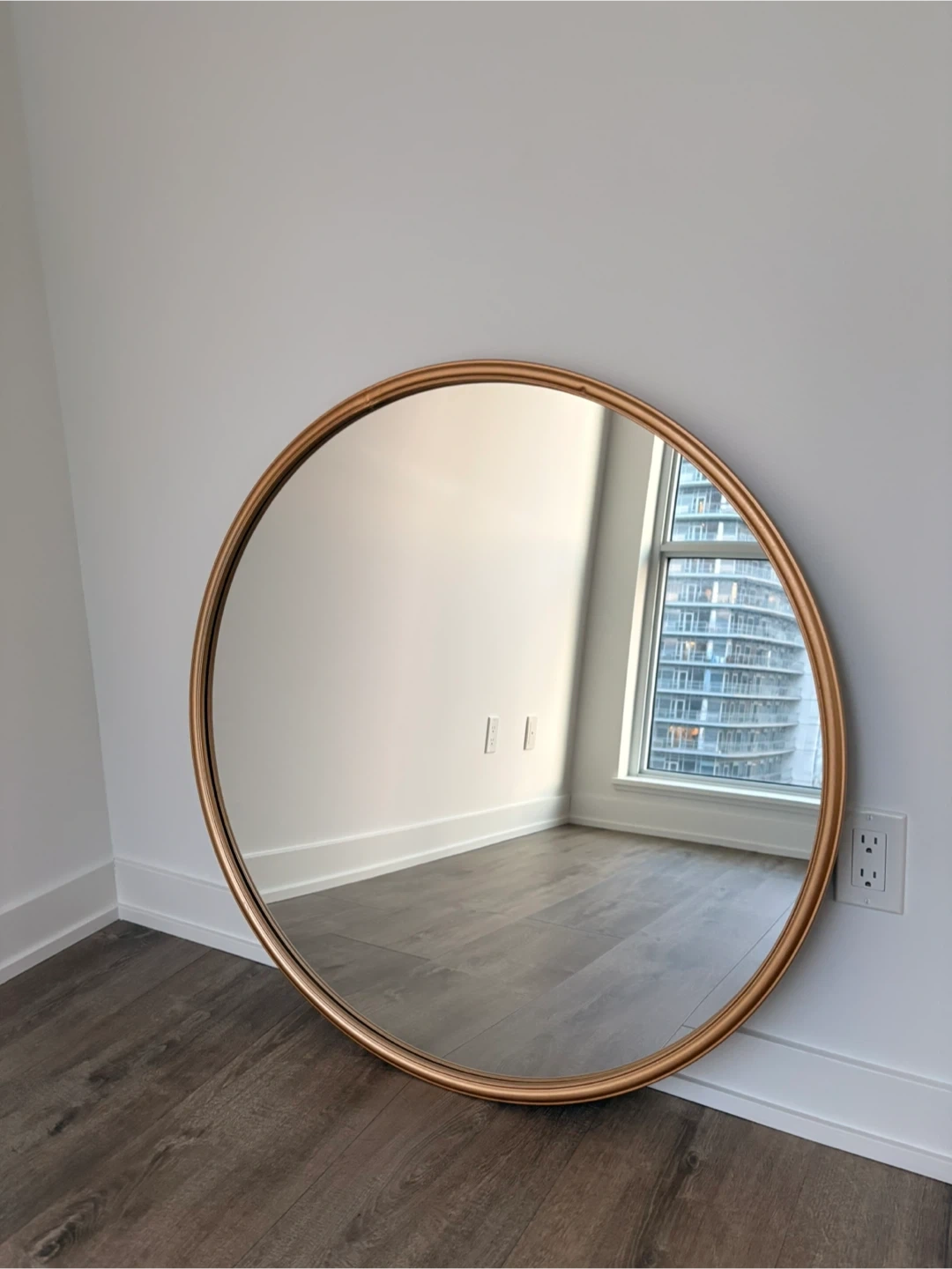 This round mirror has a stylish gold metal frame. It's perfect for adding a touch of elegance to any room. It reflects light nicely and can make spaces feel larger.