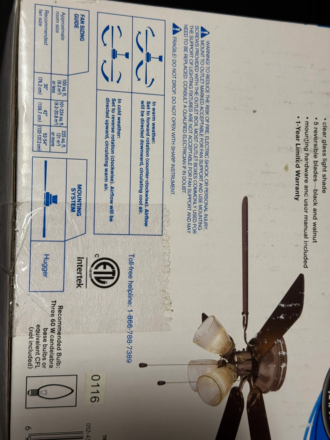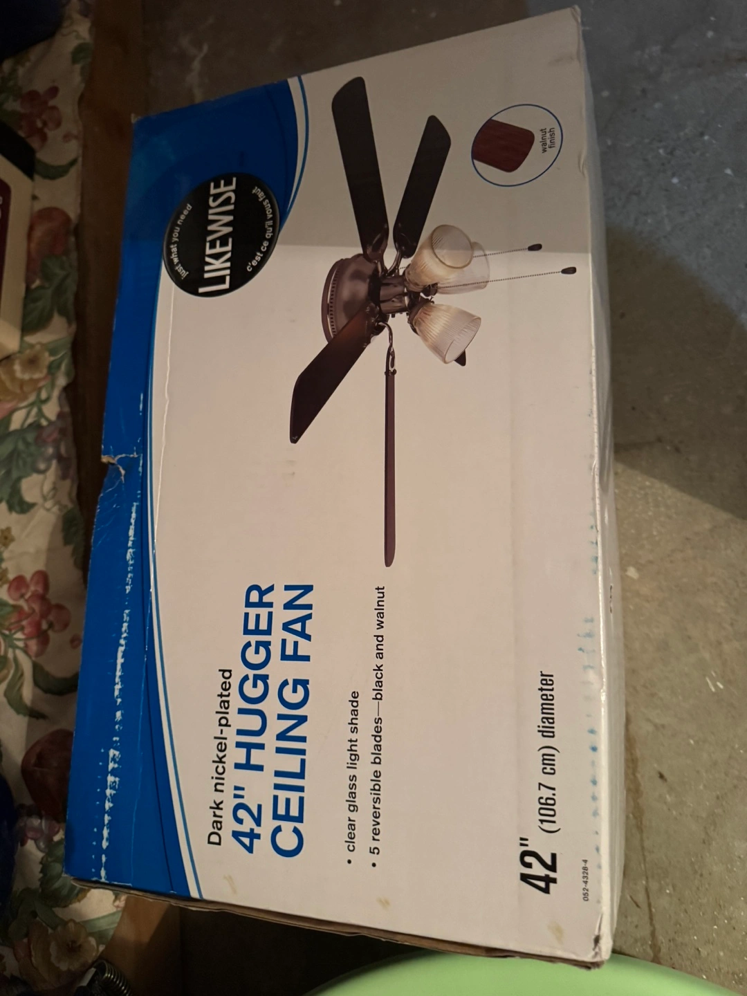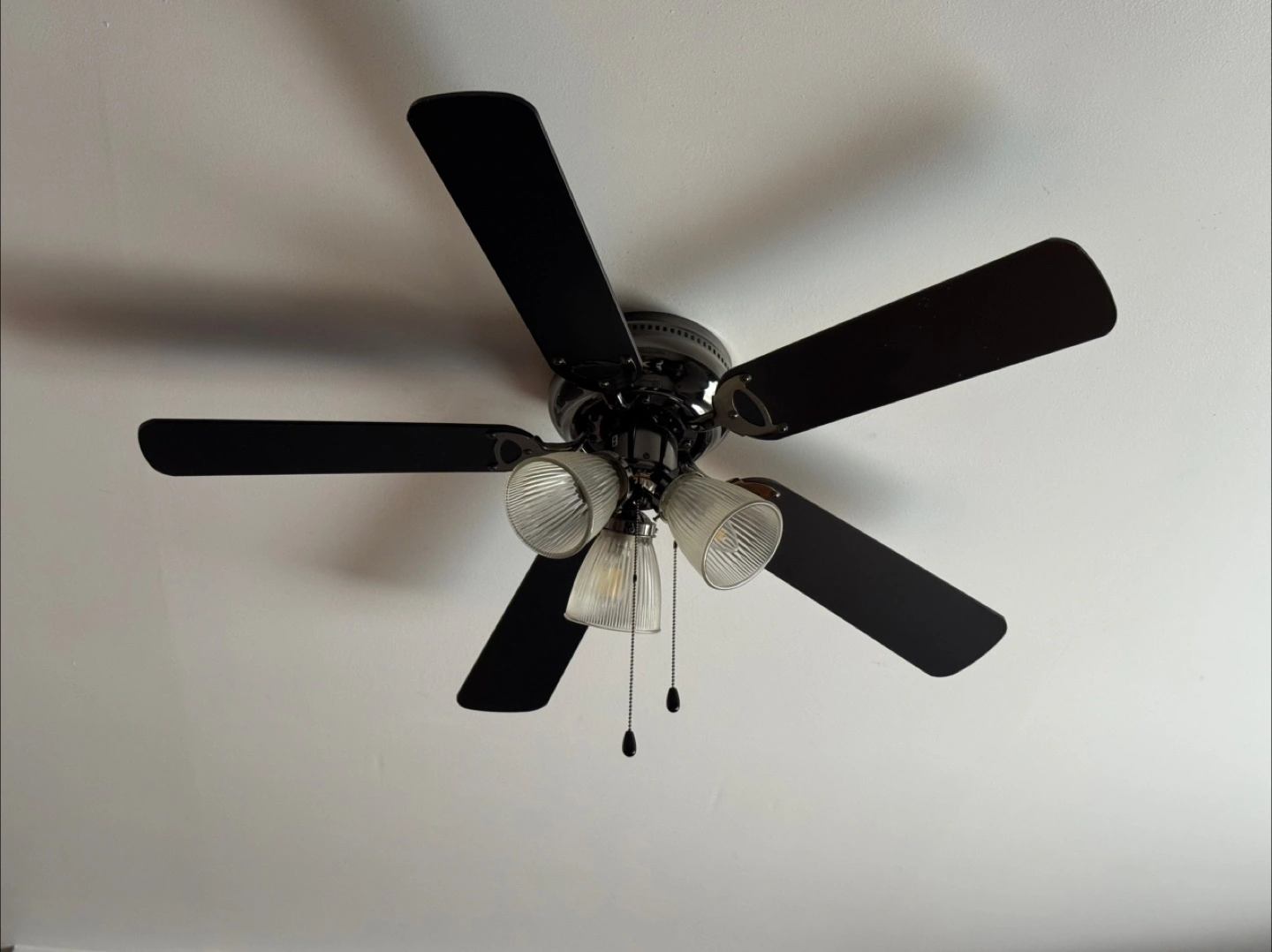 Dark nickel-plated ceiling fan with clear glass light shade, 5 reversible blades - black and walnut. 42 inches in diameter.