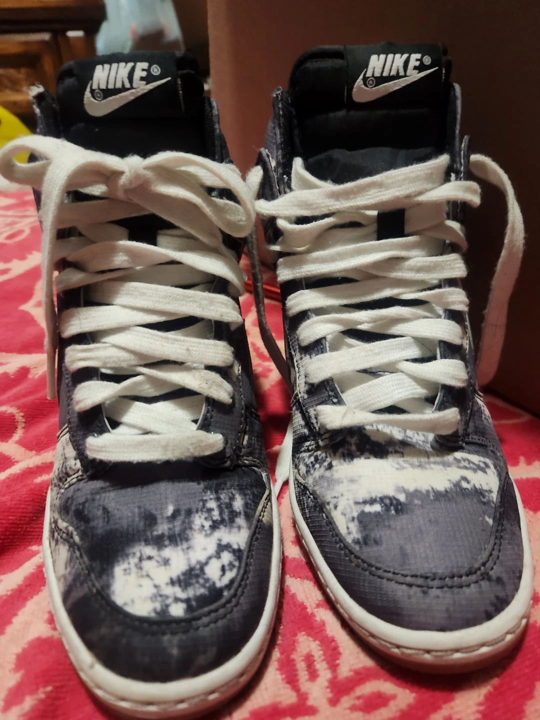 These Nike Dunk Sky Hi wedge sneakers feature a black and white tie-dye pattern. They have white laces and a white sole. Perfect for adding a stylish touch to any casual outfit!