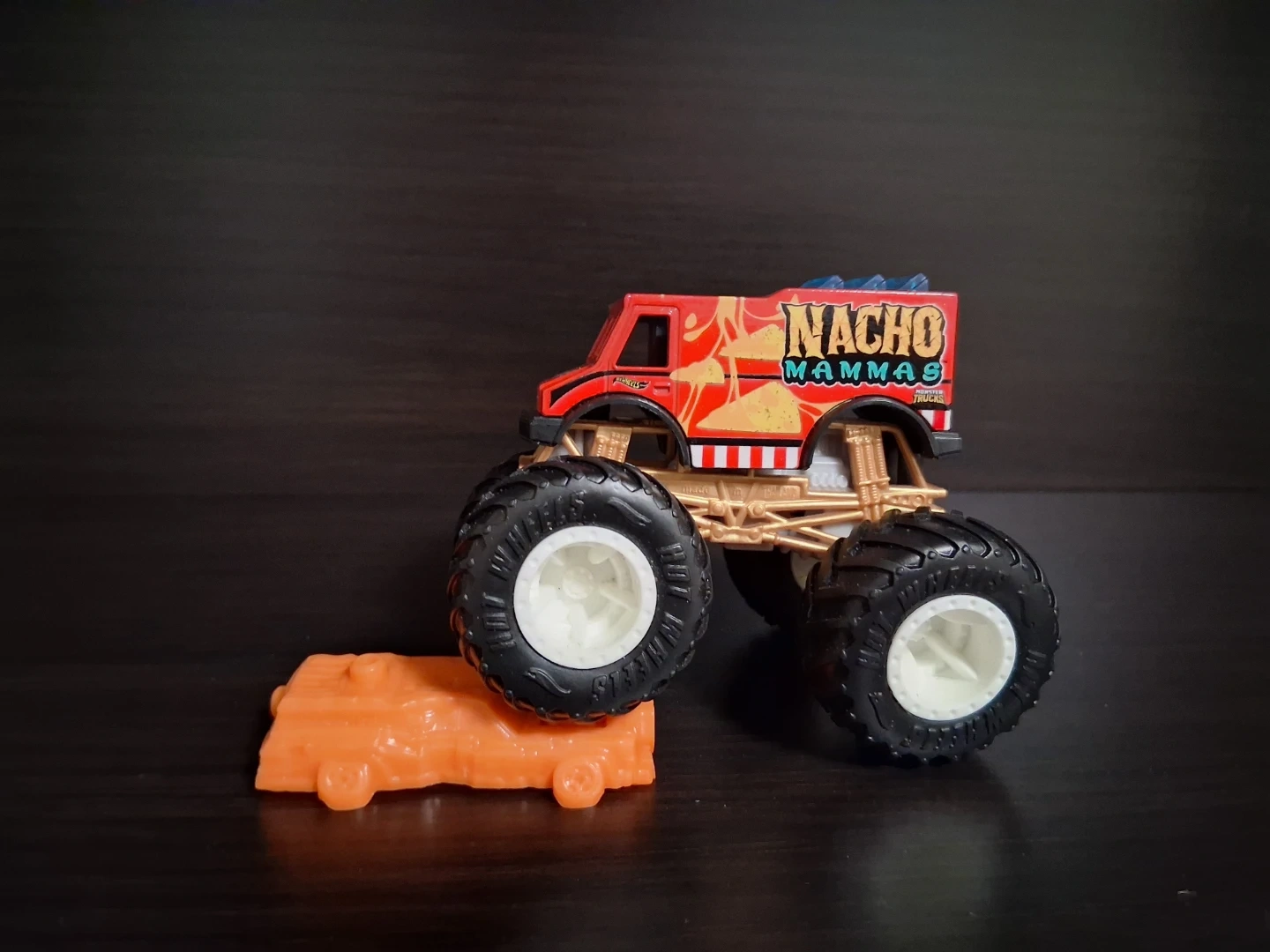 This is a Hot Wheels Monster Truck with 'Nacho Mammas' branding. It features large, rugged tires and a gold-coloured chassis. Includes an orange accessory piece.
