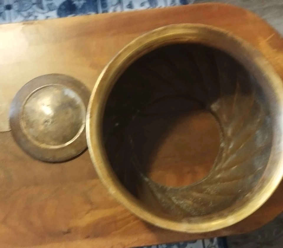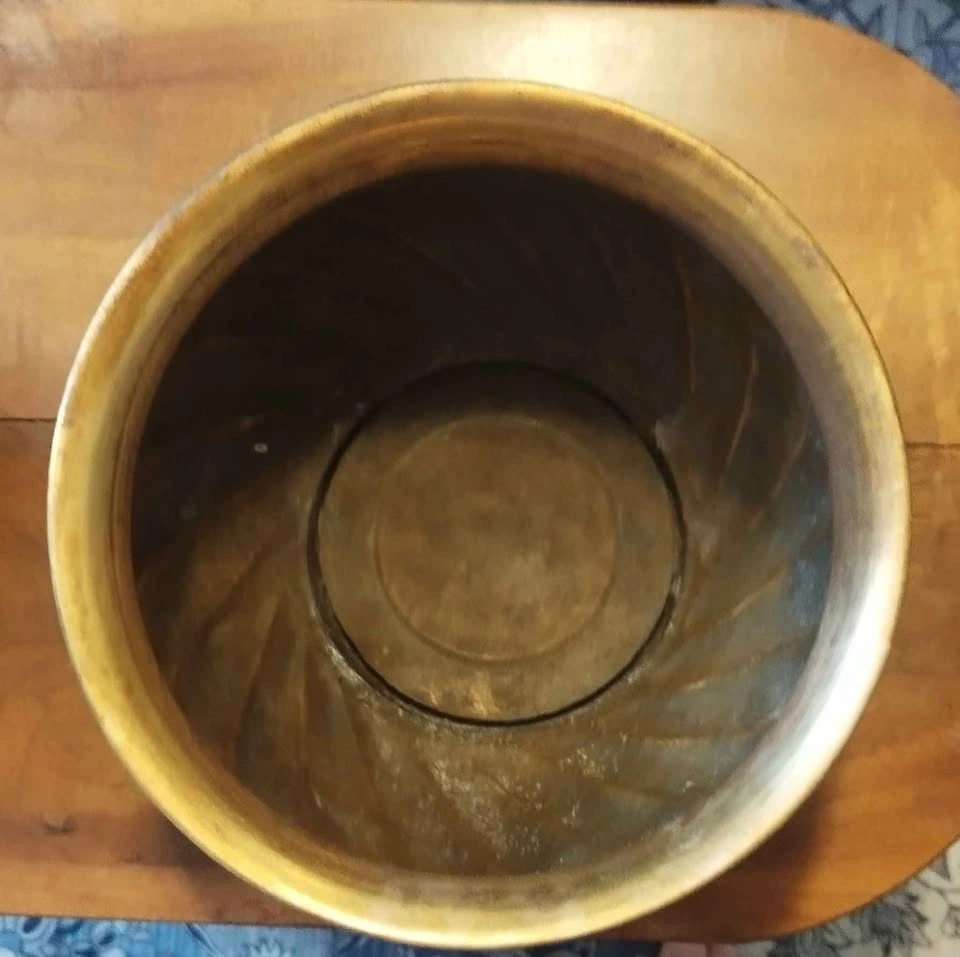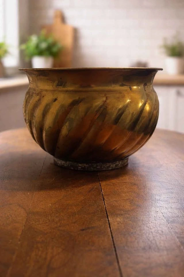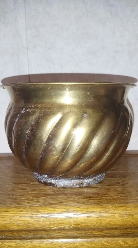 Charming brass planter pot with a cool swirled design. Great for adding a vintage touch to your space. Has natural patina and some discoloration from age. Pick up Stony Plain Spruce.
