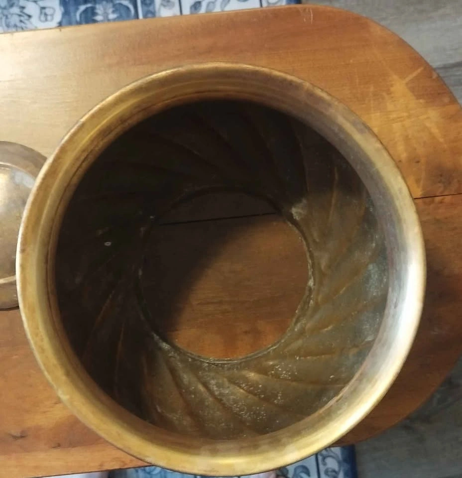 Charming brass planter pot with a cool swirled design. Great for adding a vintage touch to your space. Has natural patina and some discoloration from age. Pick up Stony Plain Spruce.