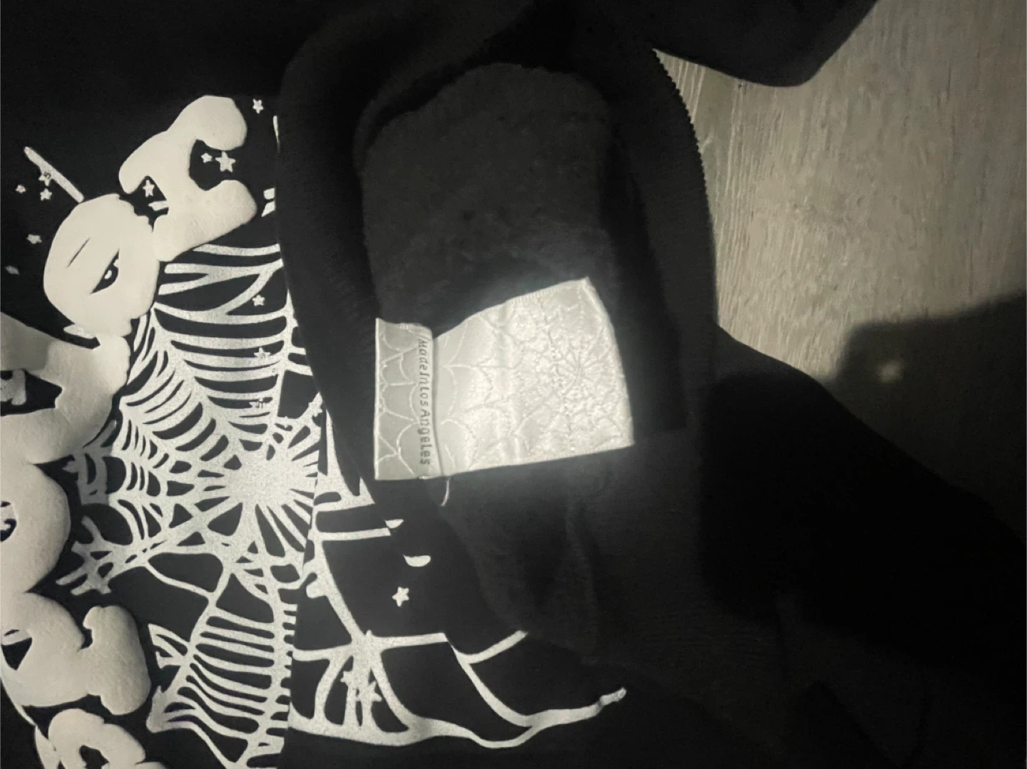 Black Sp5der hoodie with a white spider web graphic on the front and stars on the sleeves. It's a size small and made in Los Angeles. Material is a comfortable cotton blend.