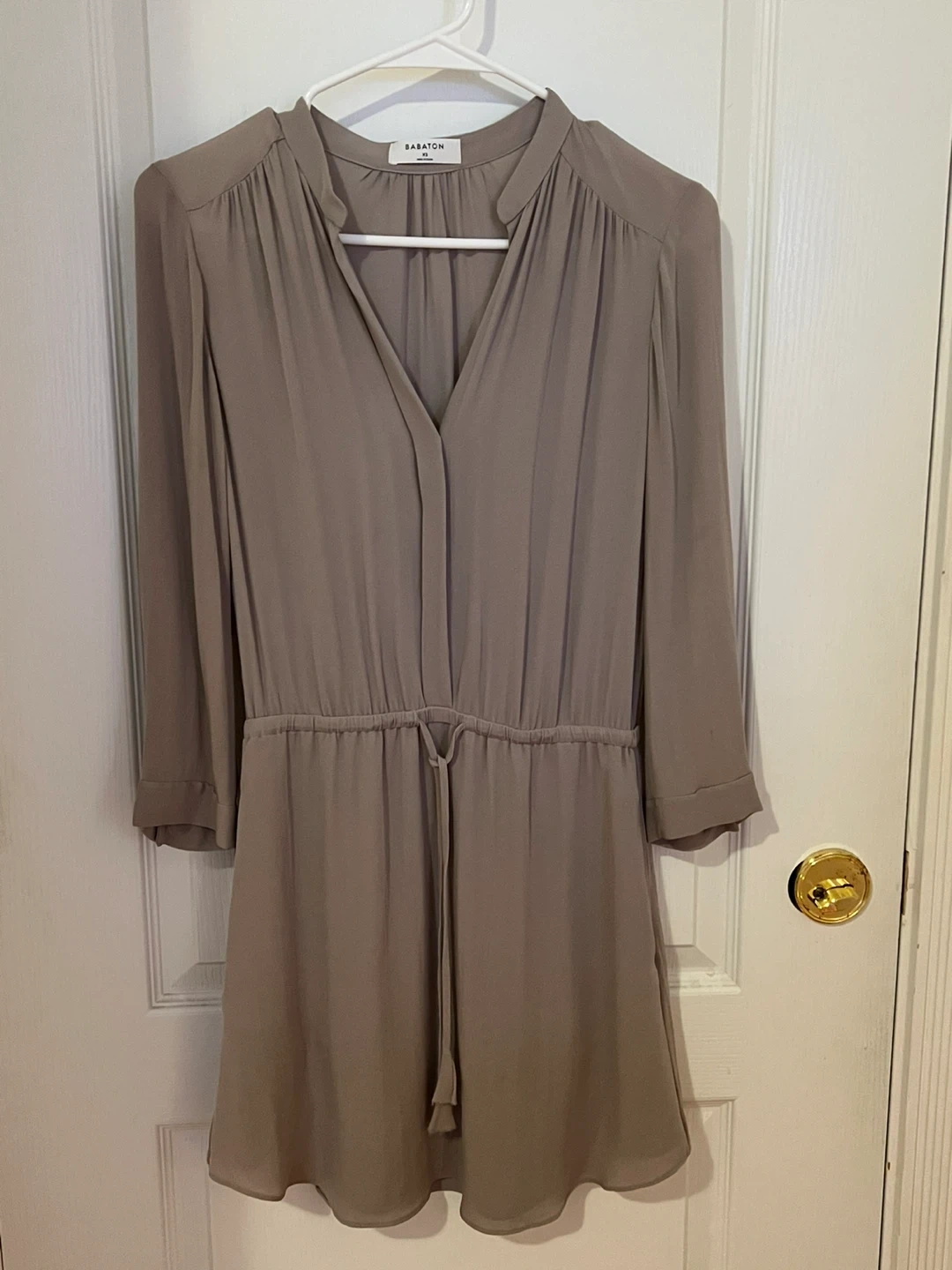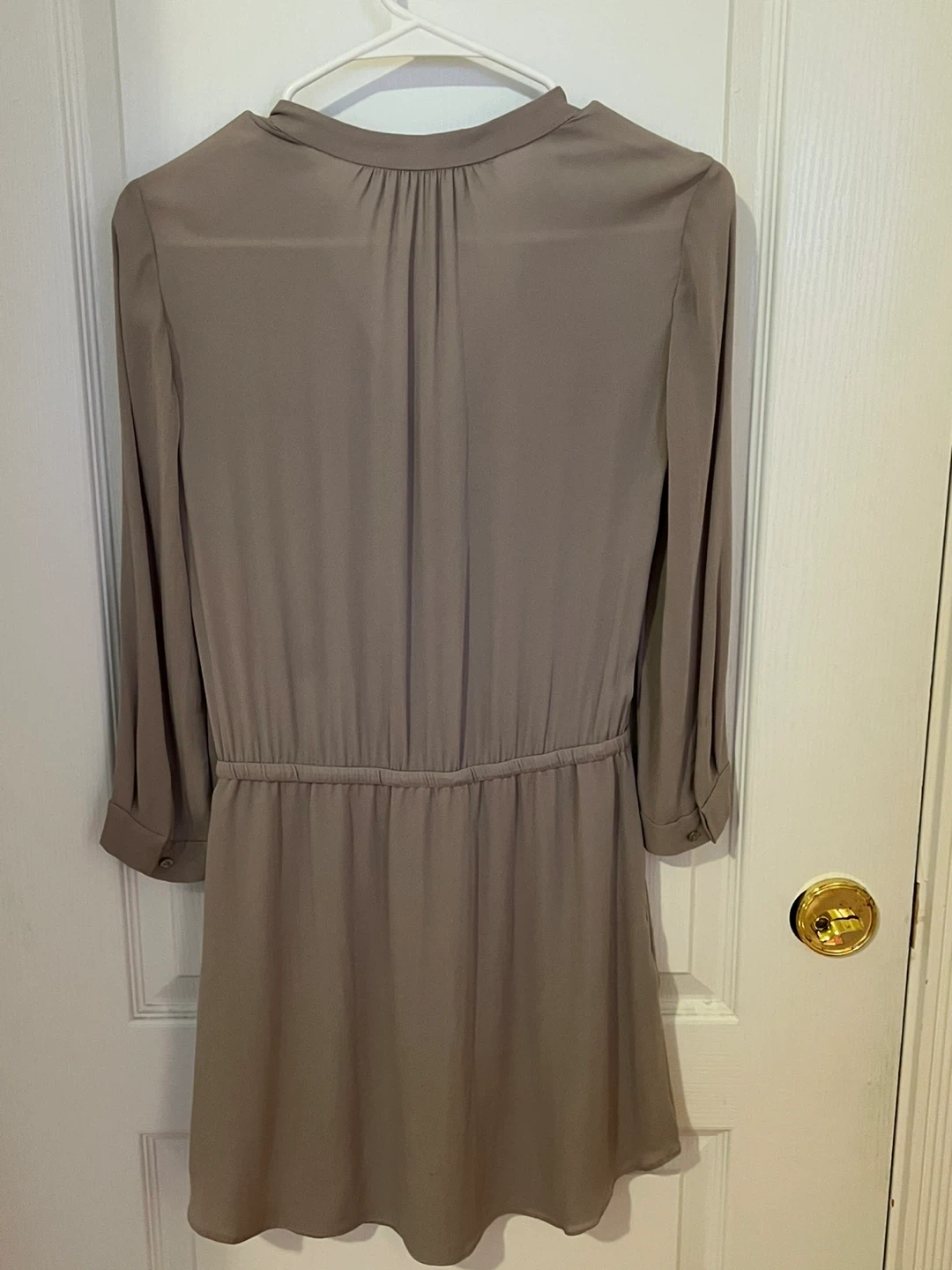 This taupe dress from Babaton features a flattering draped V-neck and a cinched elastic waist with a tie. It's made from a lightweight, flowy fabric perfect for transitioning seasons. The long sleeves can be rolled up and secured with button tabs. Dress it up or down!