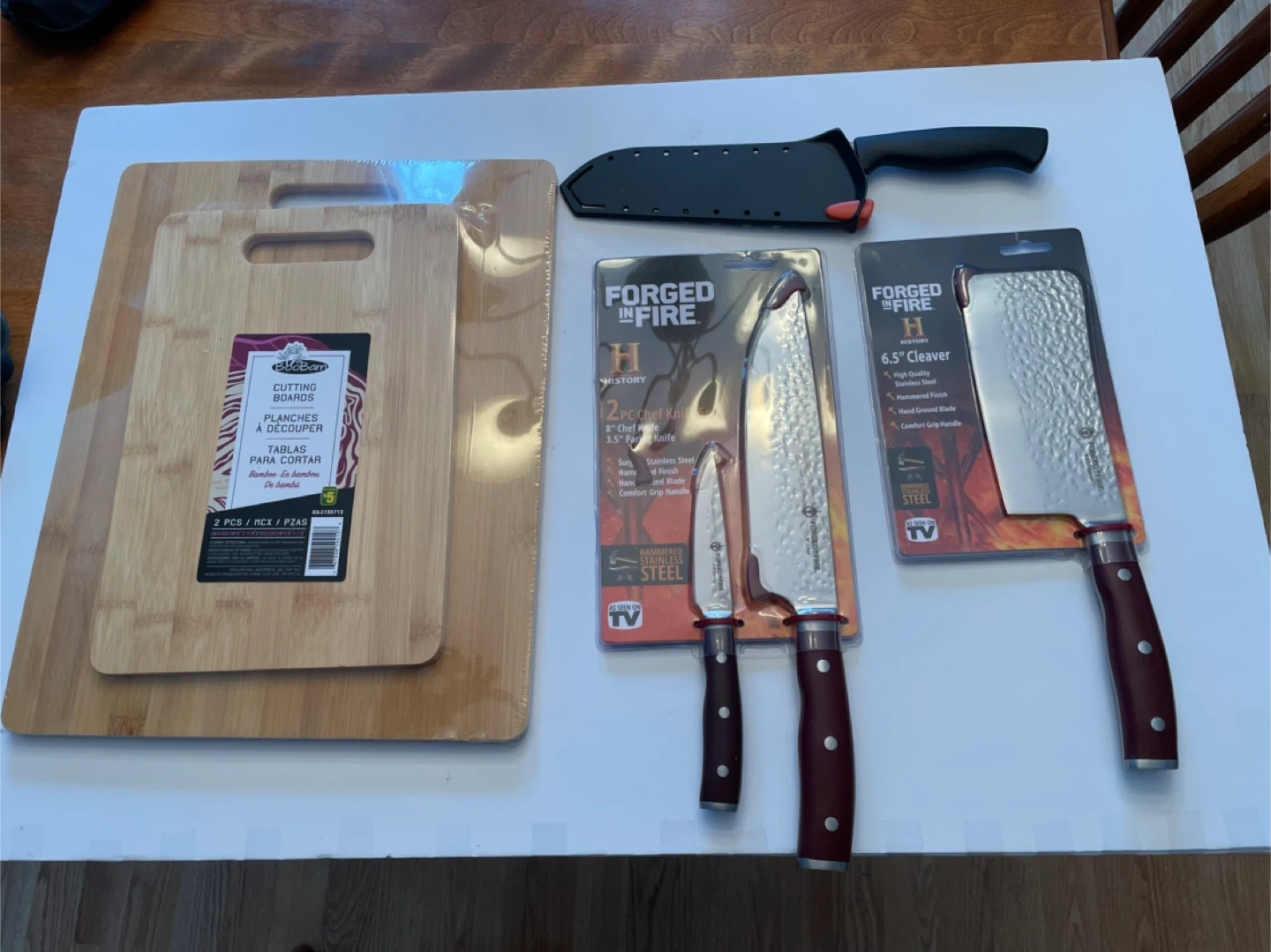 This set includes a 2-piece bamboo cutting board set and a Forged in Fire knife set. The knife set features a hammered finish, high-quality stainless steel, and comfort grip handles. It includes an 8" chef knife, a 3.5" paring knife, and a 6.5" cleaver, everything you see for $30.