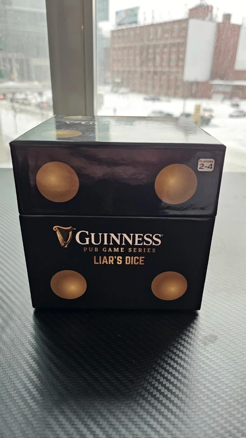 This Guinness Pub Game Series set includes Liar's Dice. It's designed for 2-4 players and comes with dice cups and dice. Perfect for game nights with friends!